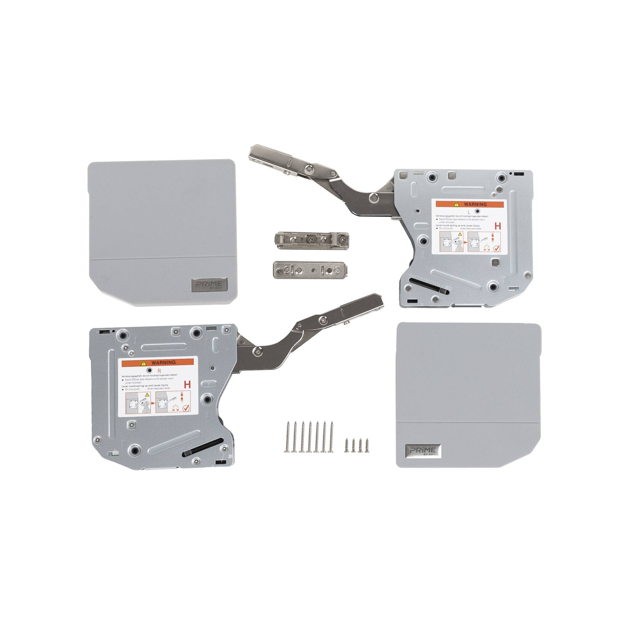 Комплект включает в себя: подъемный механизм – 2 шт, пластиковая заглушка – 2 шт, крепление фасада – 2 шт, саморез 4х16 – 4 шт, комплект шаблонов для установки, инструкция по установке.
