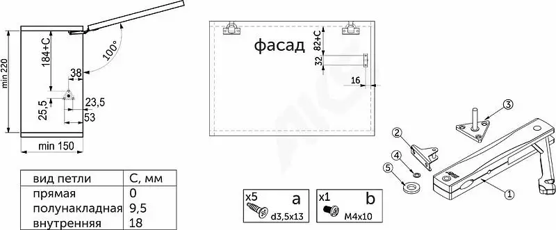 В комплект входит: подъемник - 1 шт, крепление фасада - 1 шт, крепление корпуса - 1 шт, шайба - 2 шт, саморезы 3,5*16 - 5 шт, винт М4*10 - 1 шт, шаблон, инструкция.