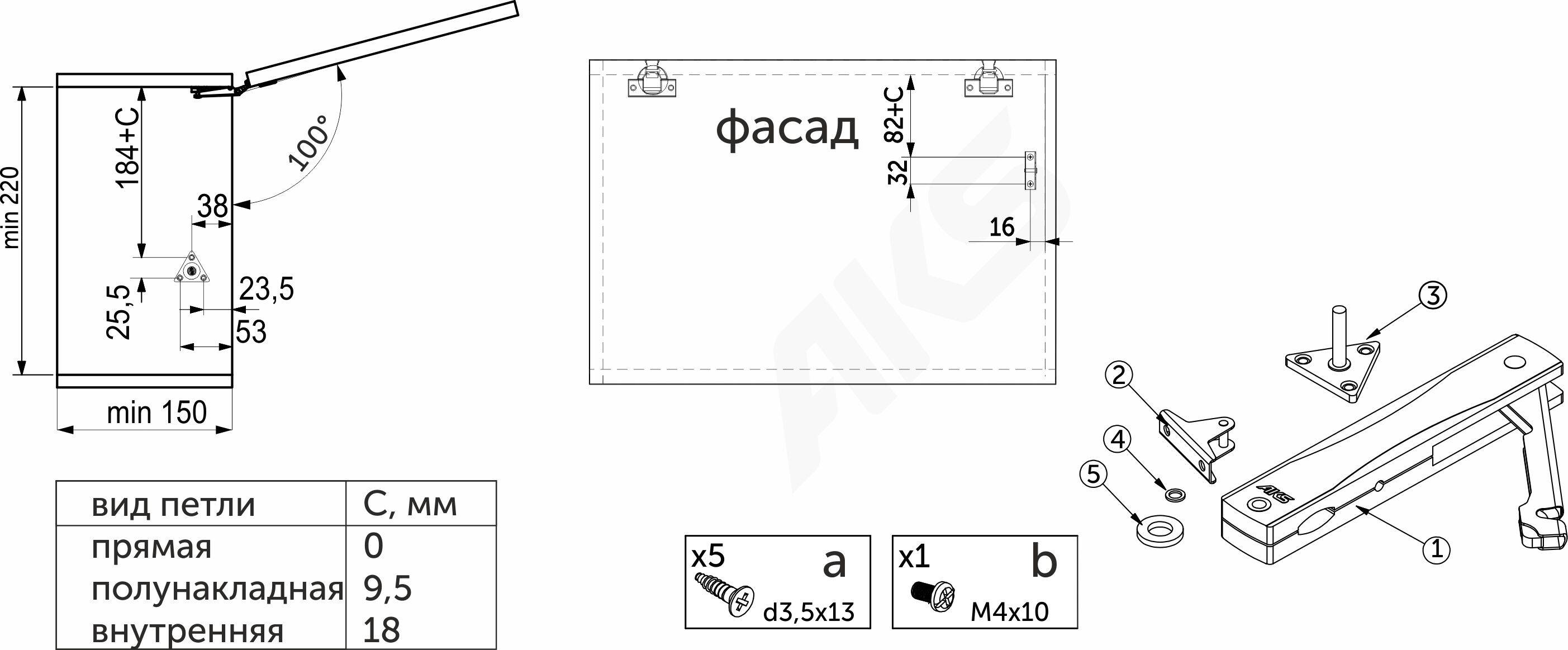 В комплект входит: подъемник - 1 шт, крепление фасада - 1 шт, крепление корпуса - 1 шт, шайба - 2 шт, саморезы 3,5*16 - 5 шт, винт М4*10 - 1 шт, шаблон, инструкция.