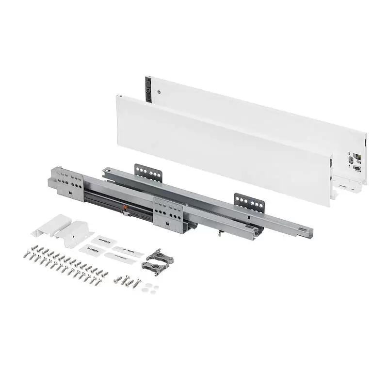 Комплект системы выдвижения для сборки выдвижного мебельного ящика с прямыми боковинами. Самостоятельно требуется изготовить только дно, заднюю стенку ящика и фасад.