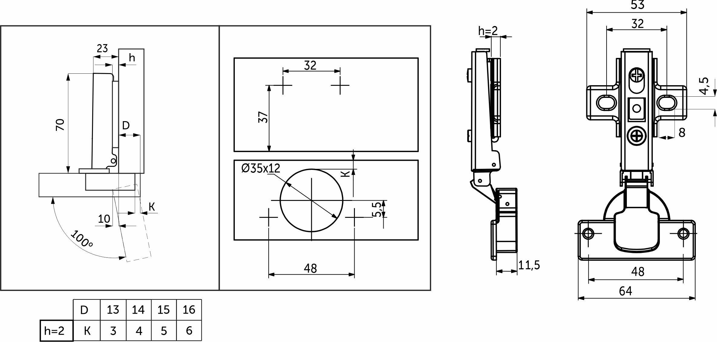 Петля предназначена для фасадов толщиной от 15 до 22 мм, имеет межцентровое расстояние между отверстиями в чашке в 48мм, а также высоту монтажной планки h2.