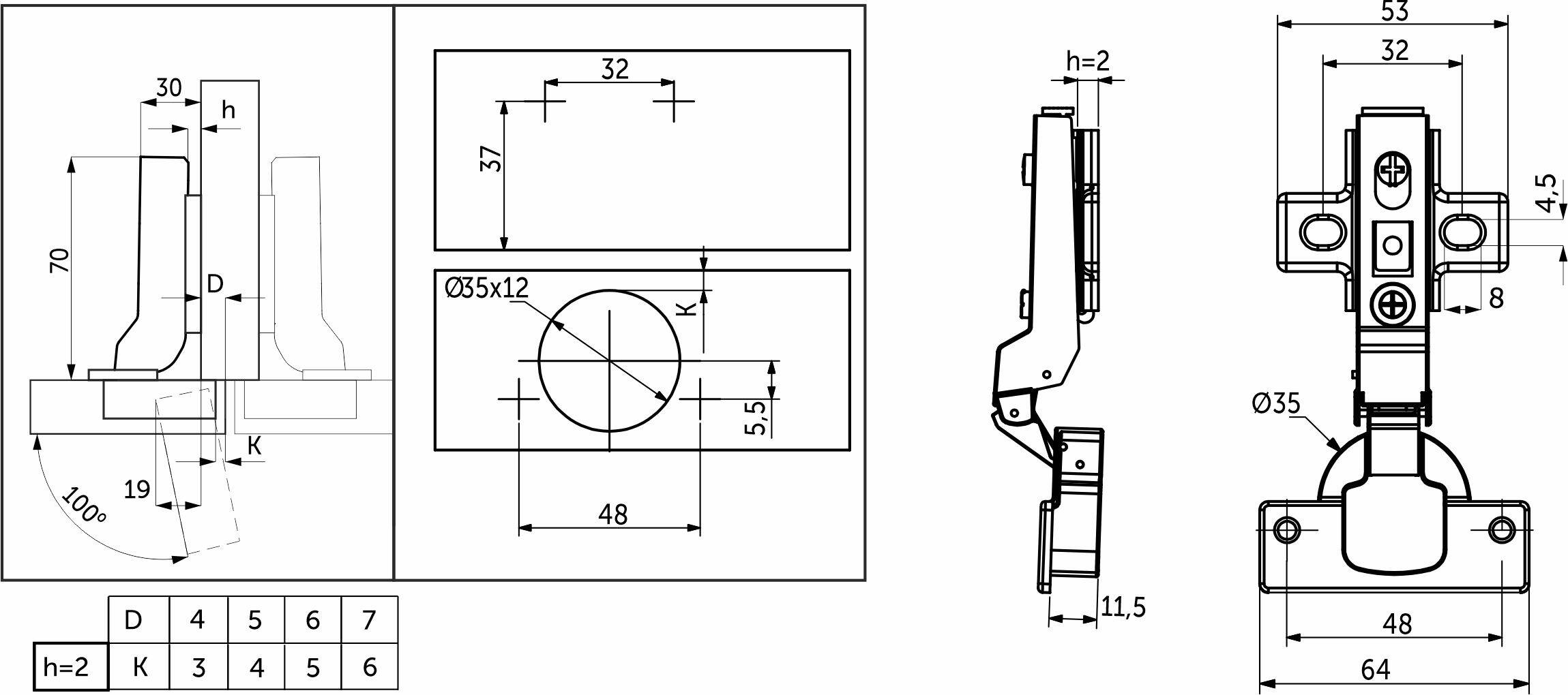 Изготовлена из холоднокатанной стали. Диаметр чашки петли составляет ∅35 мм. Глубина чашки 11,5 мм. Глубина сверления, необходимая для установки, 12 мм.