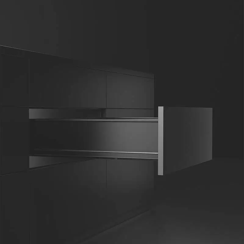 Благодаря толщине стенки в 1,4 мм, боковины выглядят минималистично, и позволяют еще больше увеличить площадь полезного пространства выдвижного ящика (по сравнению с системами выдвижения с традиционными боковинами).