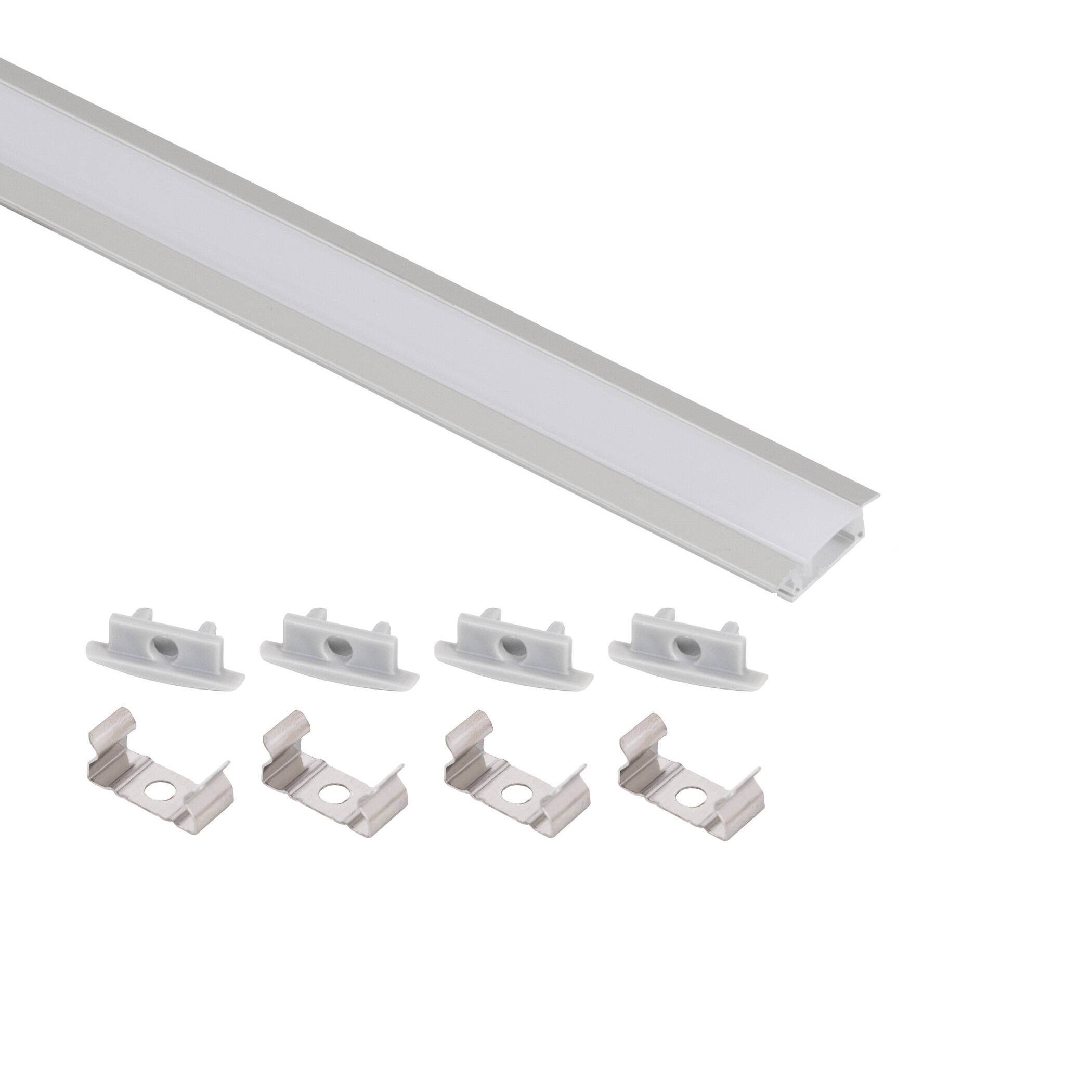 Врезной профиль в индивидуальной упаковке, (в комплекте 4 заглушки и 4 крепления, предназначен для монтажа светодиодной ленты, ширина фрезной части 17 мм, высота 7 мм, матовый экран, длина 2м., внутренняя часть вмещает ленту шириной до 12 мм.