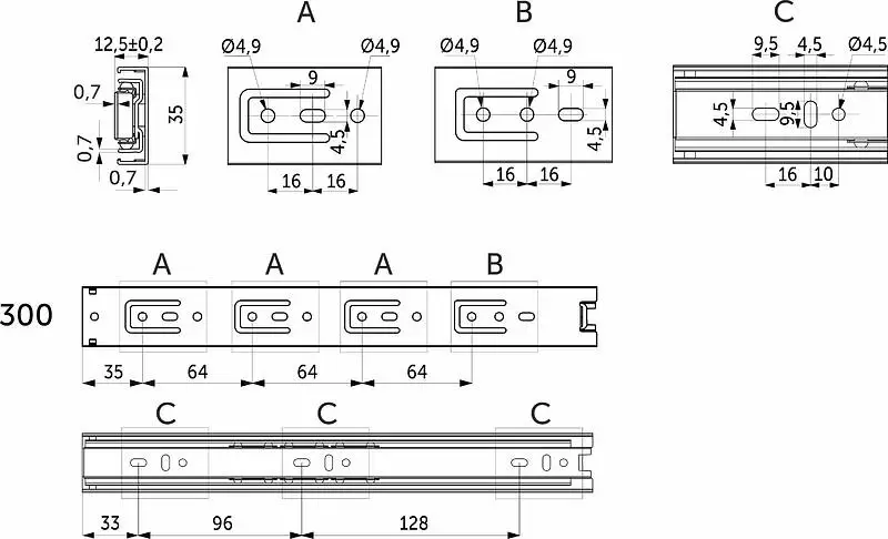 Направляющая для мебели AKS изготовлена из холоднокатаной стали толщиной 0,7*0,7*0,7 мм, имеет резиновый фиксатор от самопроизвольного открытия. Фактическая высота данной направляющей 35 мм, а её длина – 300 мм.