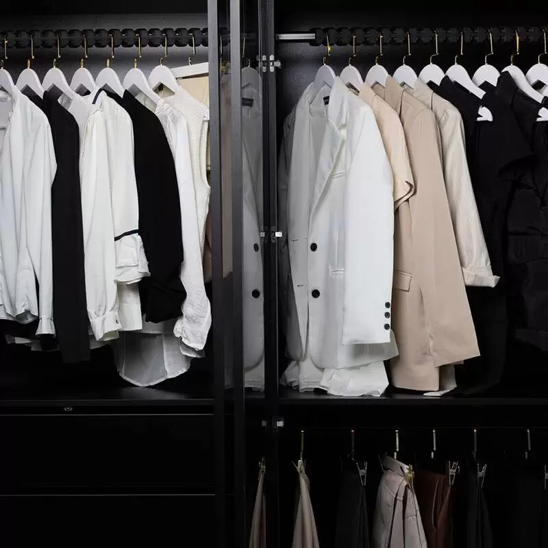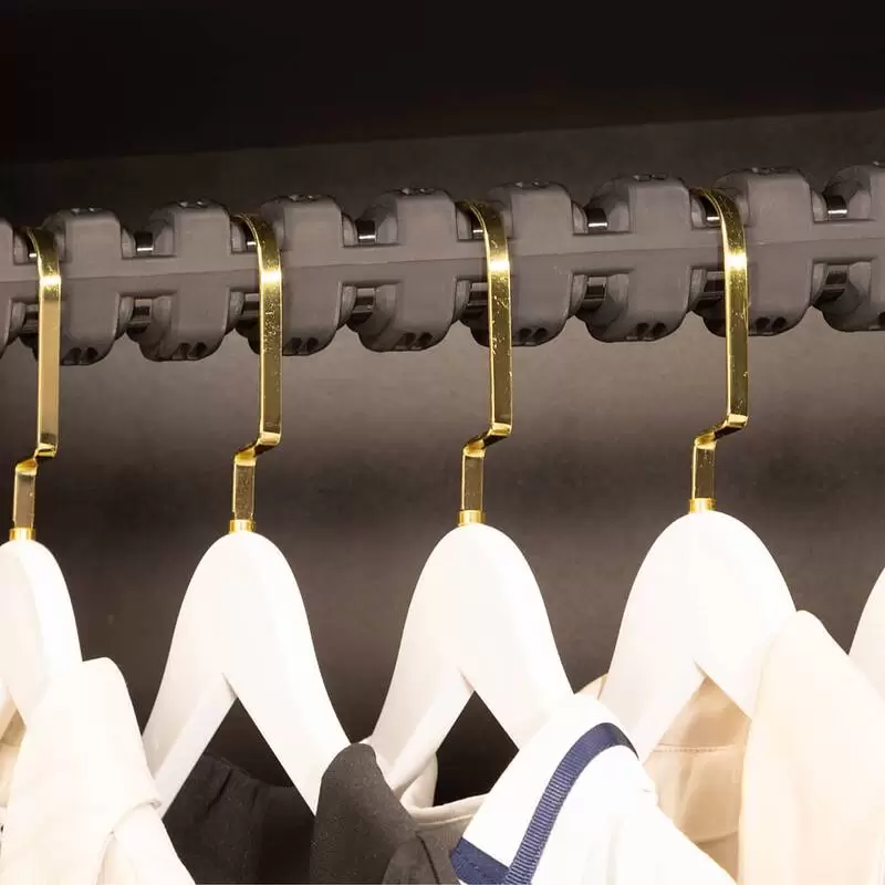 Главная особенность — продуманная конструкция с посадочными углублениями, которые фиксируют плечики под углом 45°. Благодаря этому одежда располагается не перпендикулярно, а под углом, что существенно уменьшает необходимую глубину шкафа.