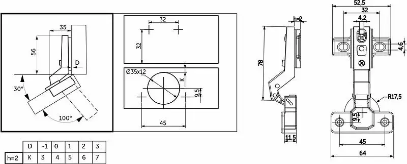 Петля угловая с системой Slide-on (надвижной монтаж), с чашкой 35 мм. Высота ответной планки Н=2 мм. Межцентровое расстояние в чашке 45 мм. Петля мебельная изготовлена из высокопрочной холоднокатаной стали. Имеет встроенный демпфер, что обеспечивает плавность закрытия петли. Угол открывания 100 градусов. Устанавливается преимущественно под скошенные фасады угловых ящиков.