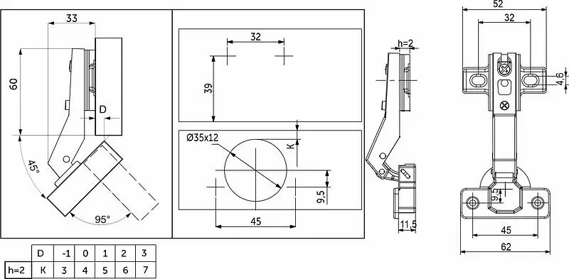Петля 45 градусов угловая самозакрывающаяся с планкой - механизм для открывания фасада под определенным углом (негативным), в соответствии с конфигурацией мебельного изделия. Имеет доводчик и систему надвижного монтажа slide on, с чашкой 35 мм. Межцентровое расстояние в чашке 48 мм. Петля изготовлена из высокопрочной холоднокатаной стали. Угол открывания 95 градусов. Устанавливается преимущественно под скошенные фасады угловых ящиков.
