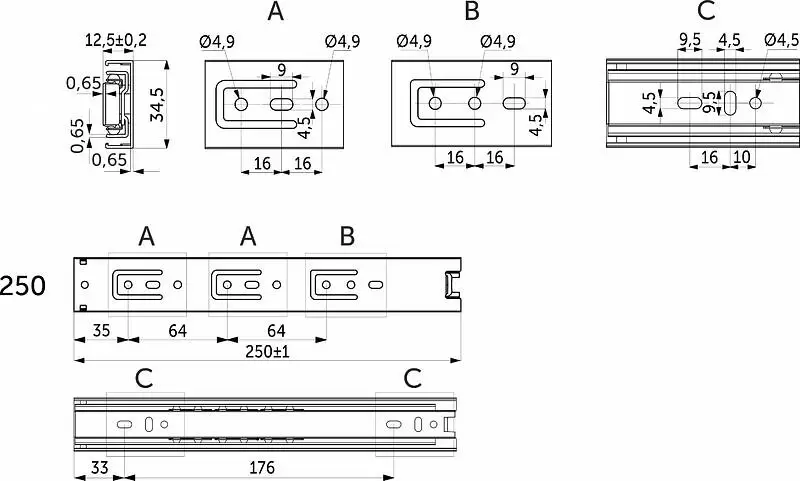 Направляющая для мебели GRIDLI изготовлена из холоднокатаной стали толщиной 0,65*0,65*0,65 мм, имеет резиновый фиксатор от самопроизвольного открытия. Фактическая высота данной направляющей 35 мм, а её длина – 250 мм.