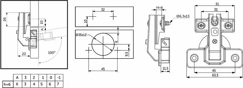 Петля угловая с системой надвижного монтажа slide on, с чашкой 35 мм. Межцентровое расстояние в чашке 45 мм. Петля для мебели изготовлена из высокопрочной холоднокатаной стали. Имеет встроенный демпфер, что обеспечивает плавность закрытия петли. Угол открывания 100 градусов. Устанавливается преимущественно под корпус с узкой фальшпанелью размером не менее 26 мм.