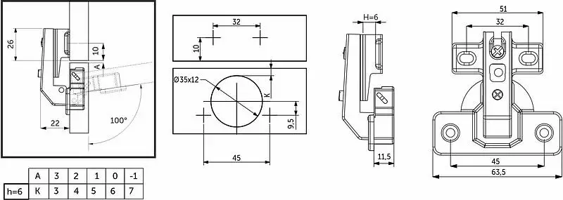 Петля угловая с системой надвижного монтажа slide on, с чашкой 35 мм. Межцентровое расстояние в чашке 45 мм. Петля для мебели изготовлена из высокопрочной холоднокатаной стали. Имеет встроенный демпфер, что обеспечивает плавность закрытия петли. Угол открывания 100 градусов. Устанавливается преимущественно под корпус с узкой фальшпанелью размером не менее 26 мм.
