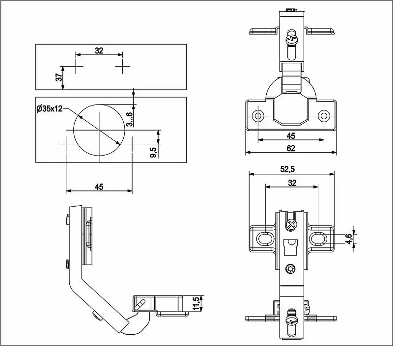 Петля угловая накладная 135 градусов карусельная с высотой планки H=2 мм. Межцентровое расстояние крепления чашки - 45 мм. Это специальный вид петли, используемый для двойных складных дверок (фасада из двух половин) в угловых открывающихся конструкциях мебельных изделий. Угол открытия - 90 гр.