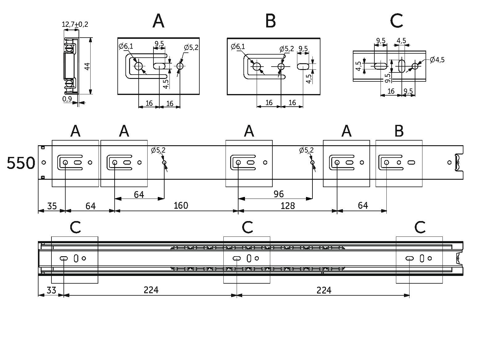 Направляющая для мебели AKS изготовлена из холоднокатаной стали толщиной 0,9*0,9*1,0 мм, имеет резиновый фиксатор от самопроизвольного открытия. Фактическая высота данной направляющей 45 мм, а её длина – 550 мм.