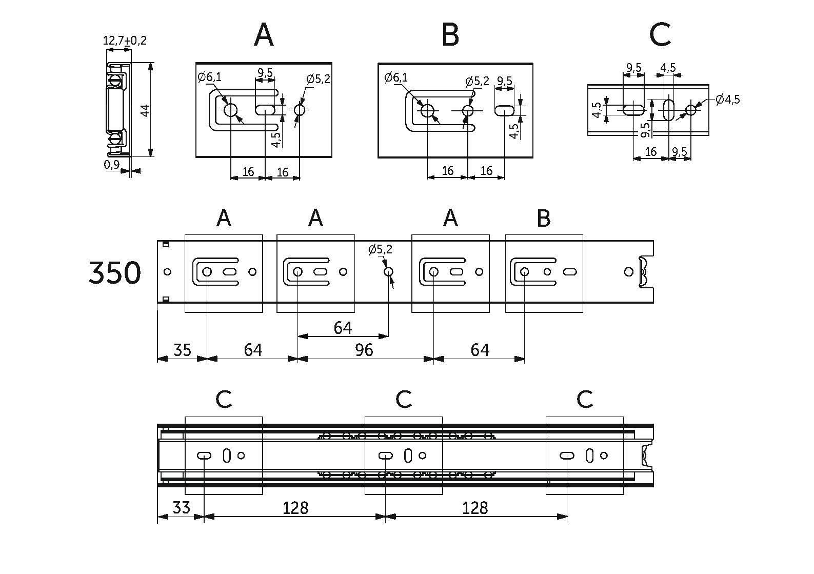 Направляющие высотой 45 мм изготовлены из холоднокатаной стали и имеет толщины 0.9*0.9*1,0, что гарантирует нагрузку до 30 кг и запас прочности в 60000 циклов. Кроме того, имеется резиновый фиксатор от самопроизвольного открытия. Длина - 350 мм.