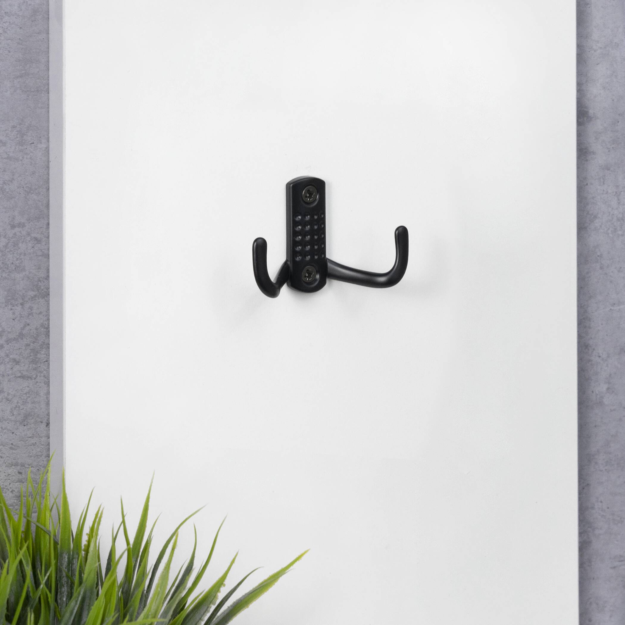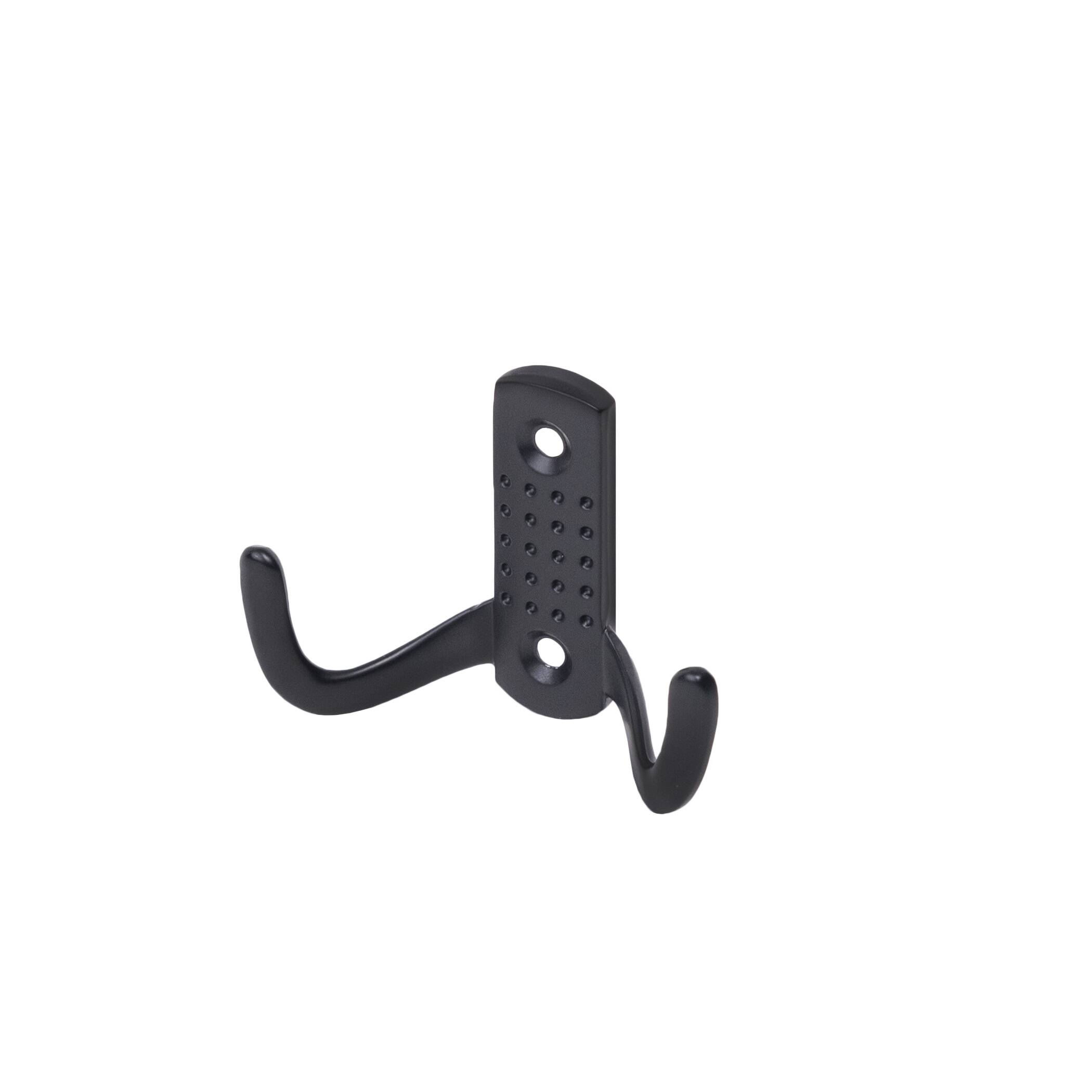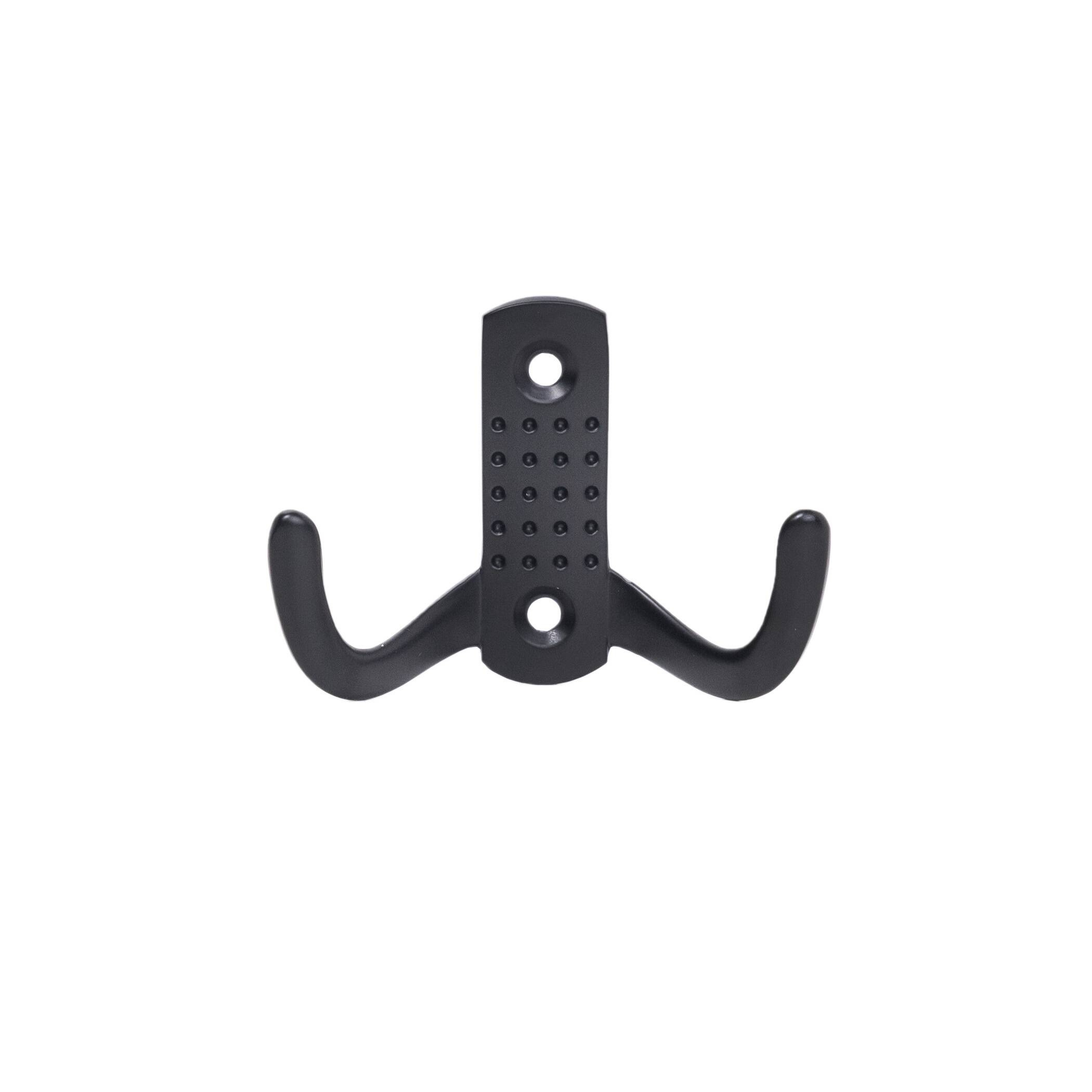 Металлический двухрожковый крючок. Подходит для использования в ванных и гардеробных комнатах. Материал - цинк-алюминий. Цвет - черный. Крепление к поверхности с помощью шурупов. В комплекте: 2 шурупа 4*18.