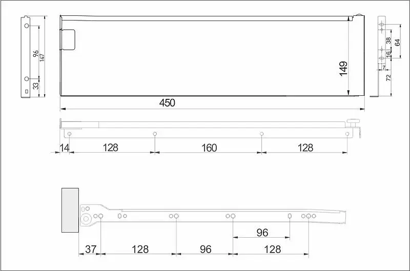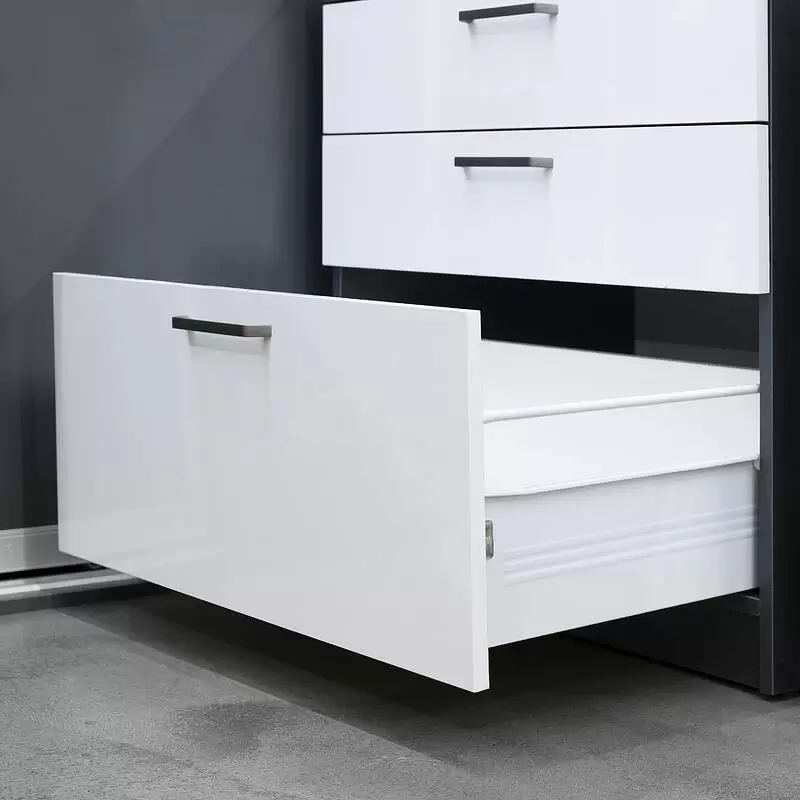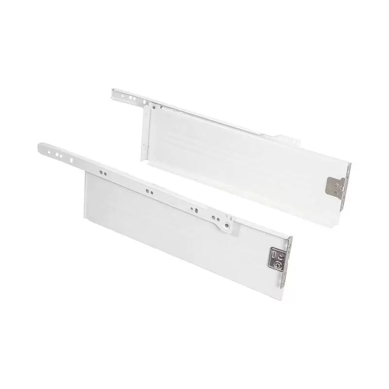 Цельнометаллический выдвижной ящик, построен на базе роликовых направляющих. Может дополнительно комплектоваться доводчиком. Нагрузка до 25 кг. Используется толщина 1 мм после покраски. Отсутствуют регулировки по плоскостям.
