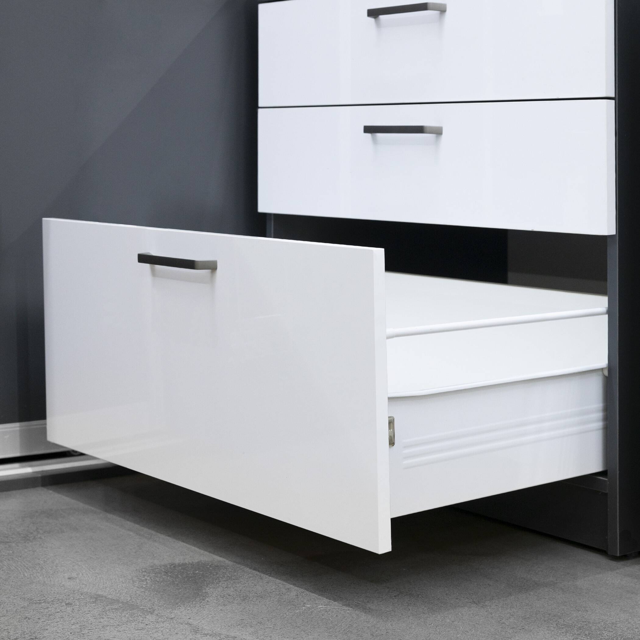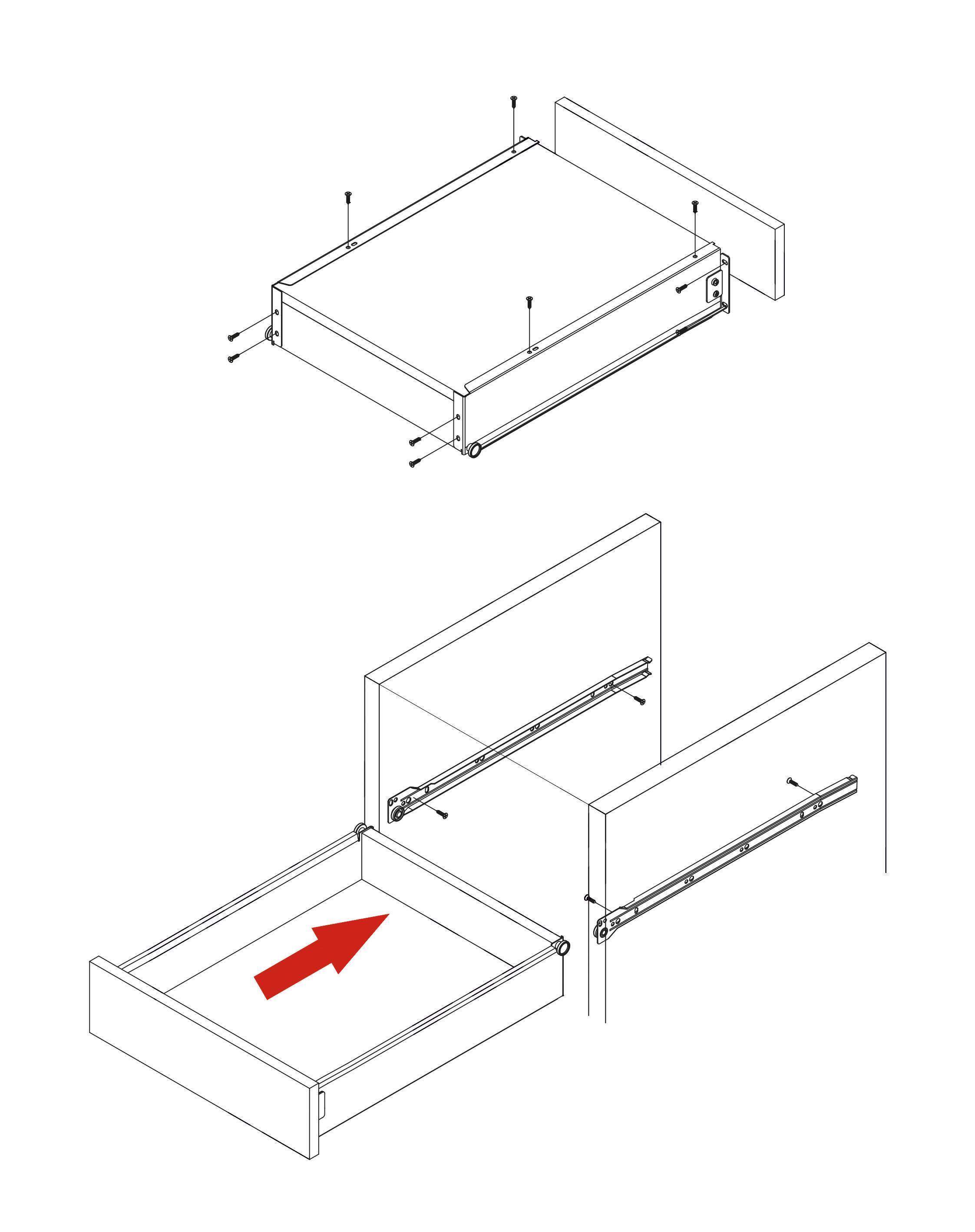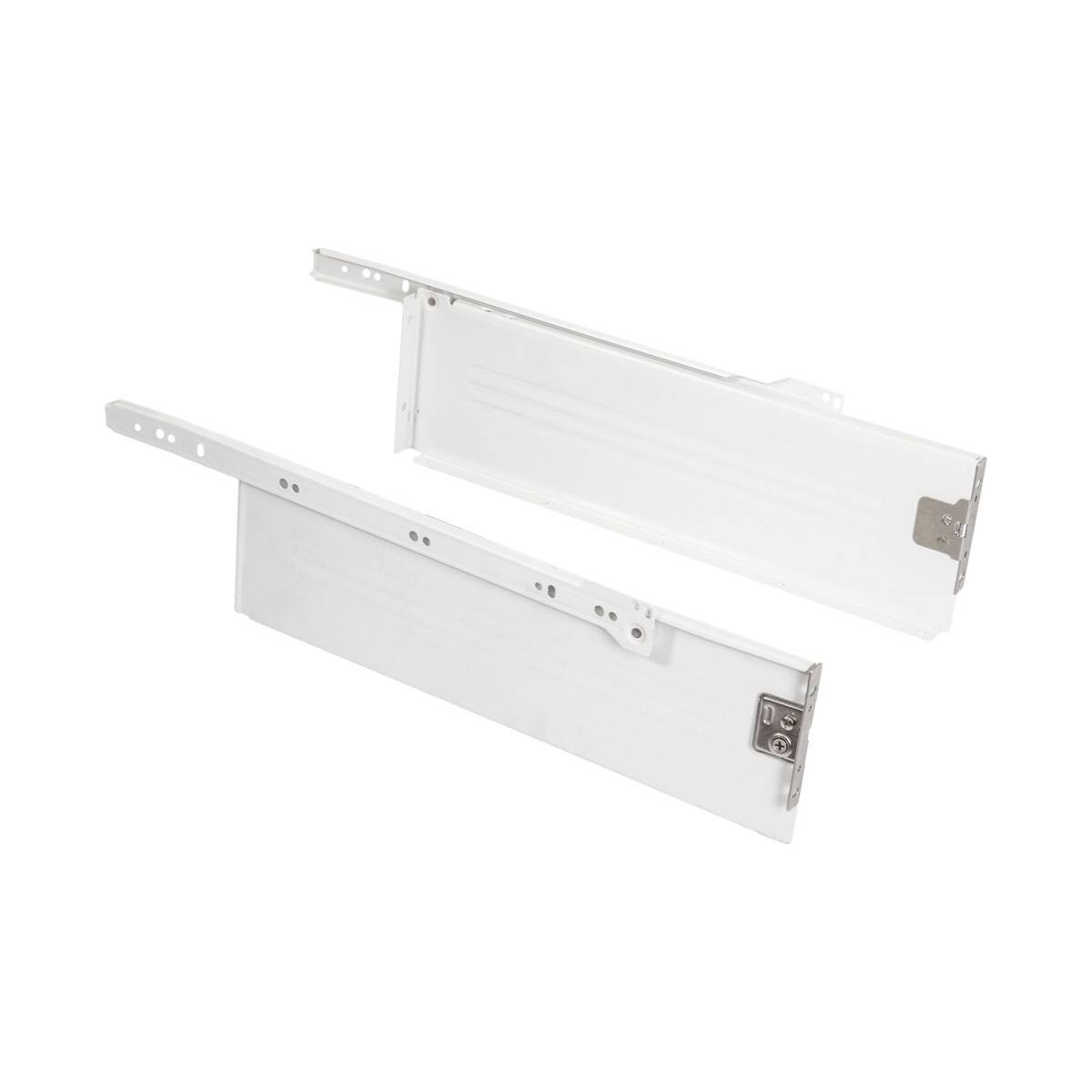 Цельнометаллический выдвижной ящик, построен на базе роликовых направляющих. Имеет две металлические боковины. Имеет неполное выдвижение. Может дополнительно комплектоваться доводчиком. Нагрузка до 25 кг. Используется толщина 1 мм после покраски. Отсутствуют регулировки по плоскостям.