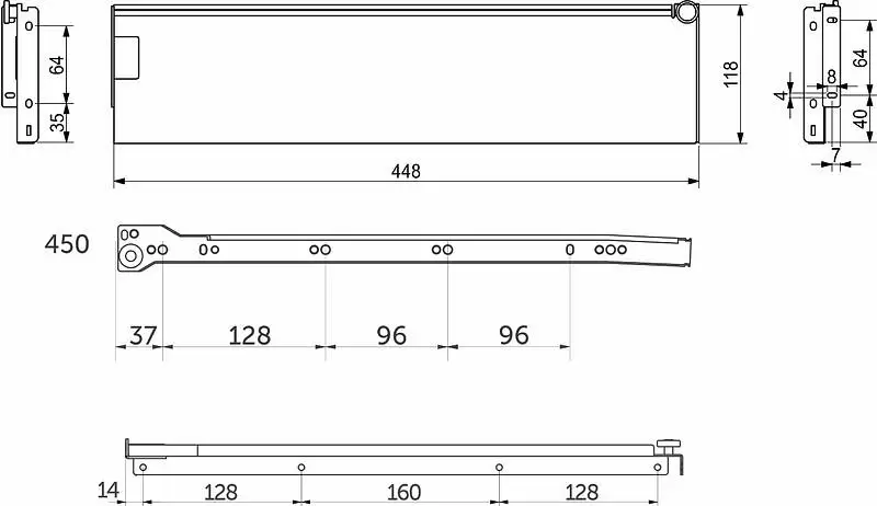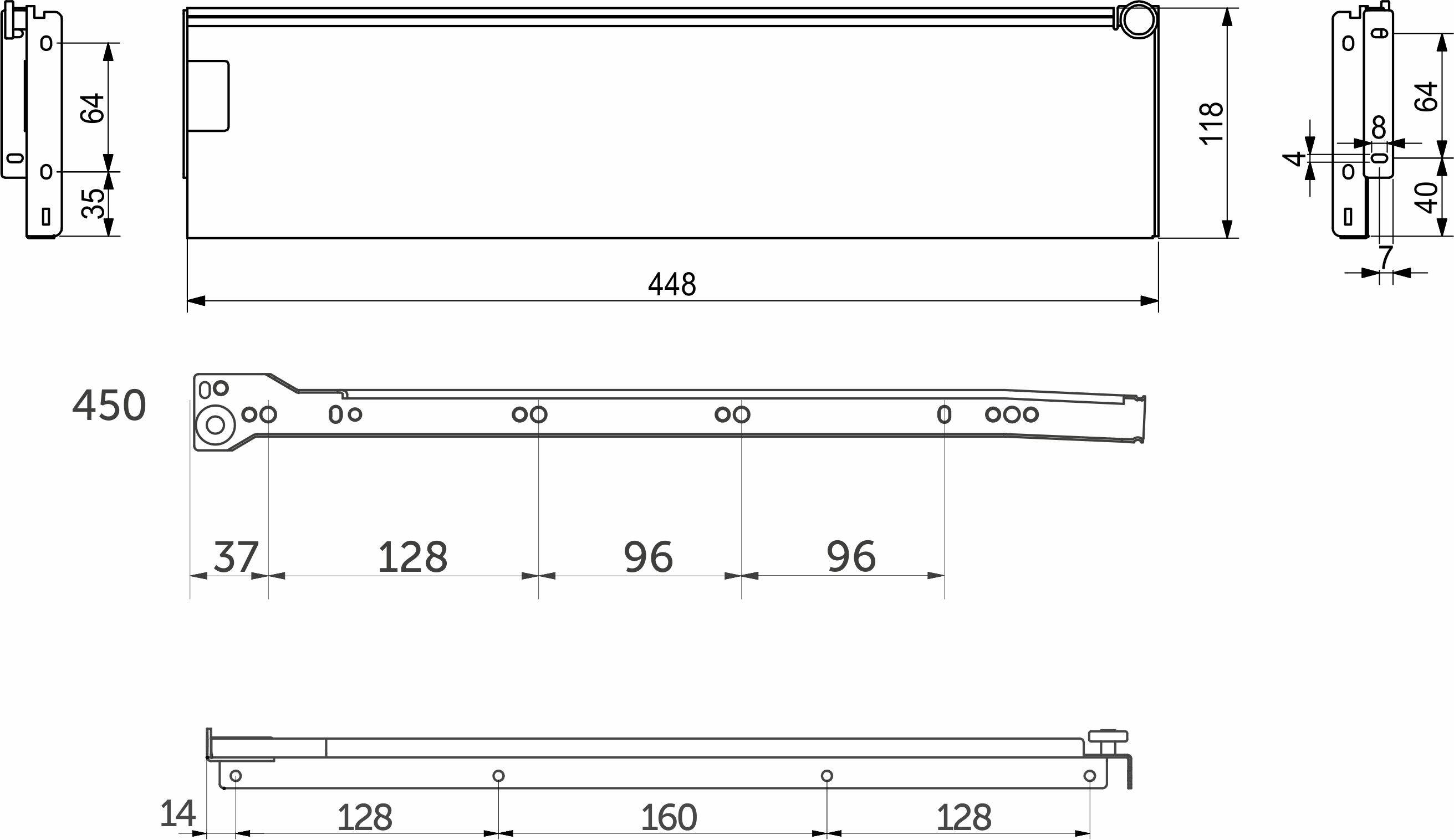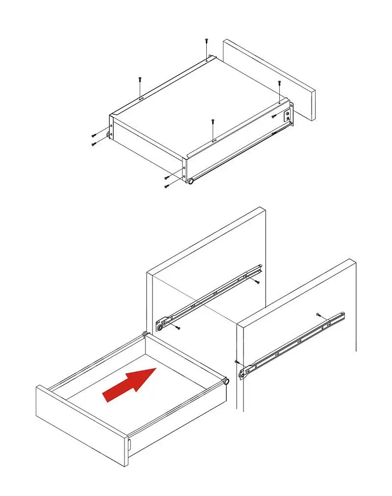 Цельнометаллический выдвижной ящик, построен на базе роликовых направляющих. Имеет две металлические боковины. Имеет неполное выдвижение. Может дополнительно комплектоваться доводчиком. Нагрузка до 25 кг. Используется толщина 1 мм после покраски. Отсутствуют регулировки по плоскостям.