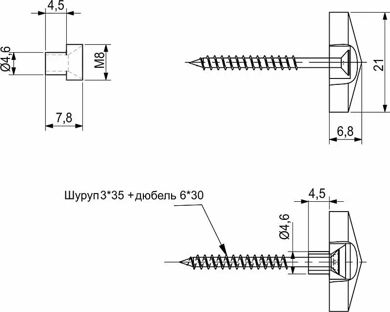 Кнопка конус используется для монтажа зеркал/стекол/скиналей к ДСП/стене методом сверления. Монтаж таким способом является более надежным и долговечным. При необходимости можно будет осуществить демонтаж стекла, предварительно открутив декоративную заглушку и выкрутив саморез. Комплектуется саморезом, дюбелем, латунной и силиконовой втулками.