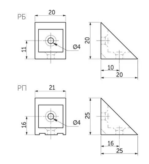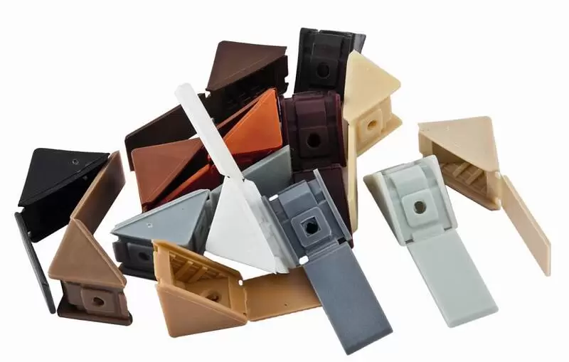 Один из видов одинарных пластиковых уголков (командорок), который имеет прикрепленную крышку. Данный уголок представлен в нескольких цветах, чтобы можно было подобрать к определенному цвету ДСП, и имеет треугольную форму. Данный вид соединения менее прочен, чем металлические уголки, но данные недостатки компенсируются низкой ценой и разнообразием цветов.