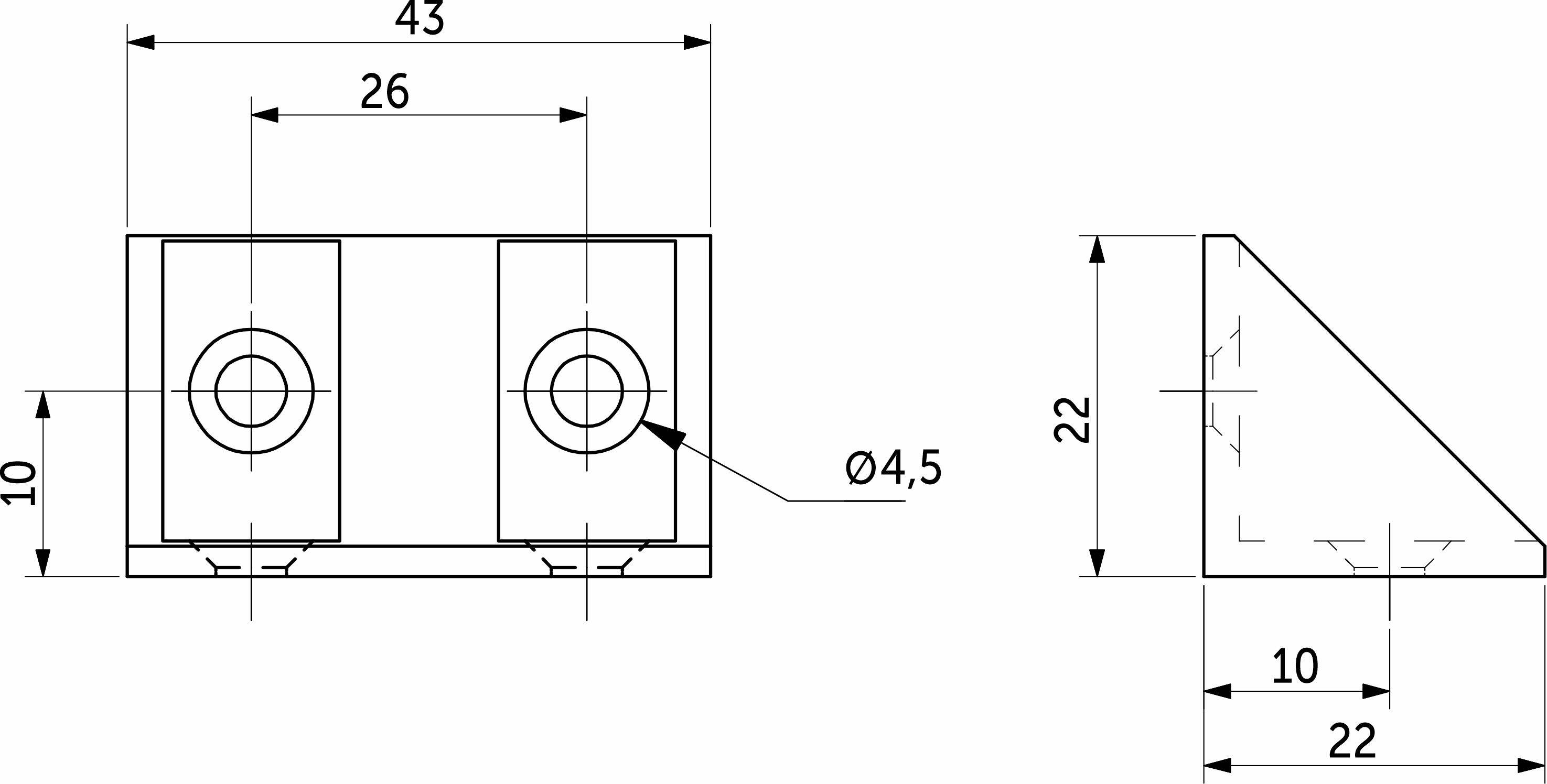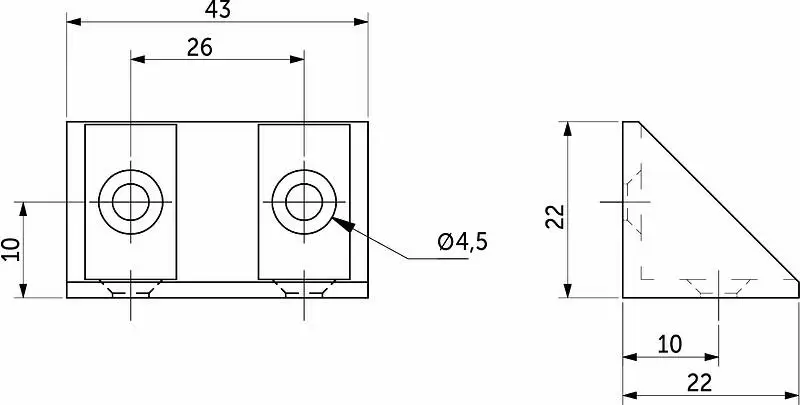 Особенностью данного уголка является увеличенная ширина изделия и 2 монтажных отверстия в каждой полке, что обеспечивает большую площадь соприкасания крепежа и элемента мебели и дополнительную прочность.