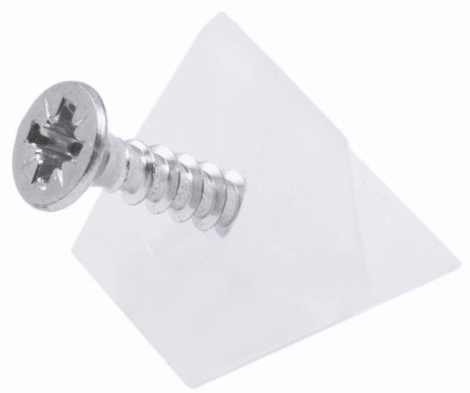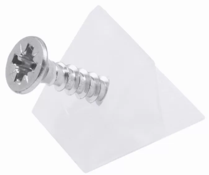 Фиксатор задней стенки ДВП служит для крепления ДВП к задней стенке корпуса ящика, в котором должен быть предварительно выфрезерован специальный паз для данного крепления. Данный вид соединения состоит из пластикового уголка специальной формы и самореза размером 3,5*20 (используется чаще всего) или 3,5*16. Фиксатор задней стенки ДВП может идти уже с предустановленным саморезом либо доукомплектовываться саморезами дополнительно.