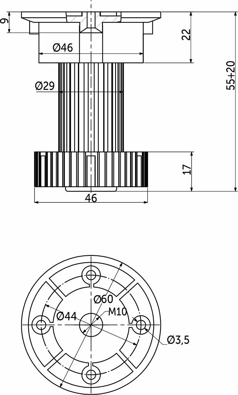 Нагрузка на опору - 190кг. Материал - полипропилен. Опора регулируется по высоте. К опоре подходит болт 106514.