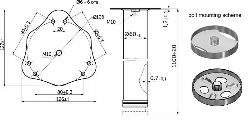 Толщина стали опоры - 0,7 мм, толщина крепления (блина) - 1,2 мм.Рекомендованная вертикальная статическая нагрузка на 4 опоры - 240кг.