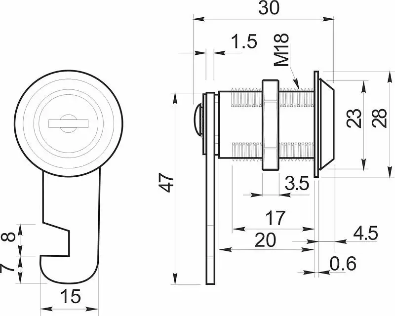 Замок (удерживающий механизм) мебельный, врезной. Обычно используется для почтовых ящиков, металлических шкафов, тумб, сумочниц, выдвижных ящиков или других подобных конструкций.