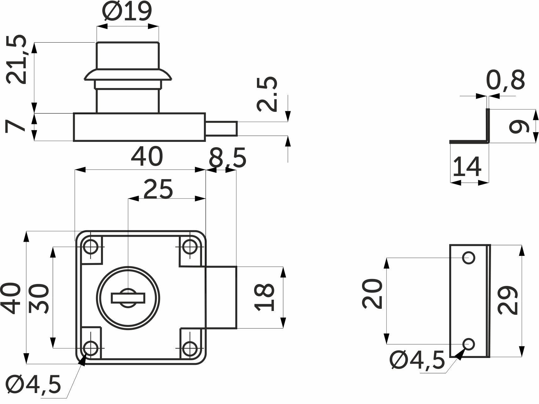 Данная модель является наиболее популярной среди мебельных замков. Замок предназначен для деревянных, ЛДСП, МДФ - фасадов толщиной 16-18 мм. Для монтажа данного типа замков необходимо высверлить отверстие для личинки цилиндра, сам же корпус замка крепится саморезами с обратной стороны фасада. С лицевой стороны фасада к замку монтируется декоративная накладка.