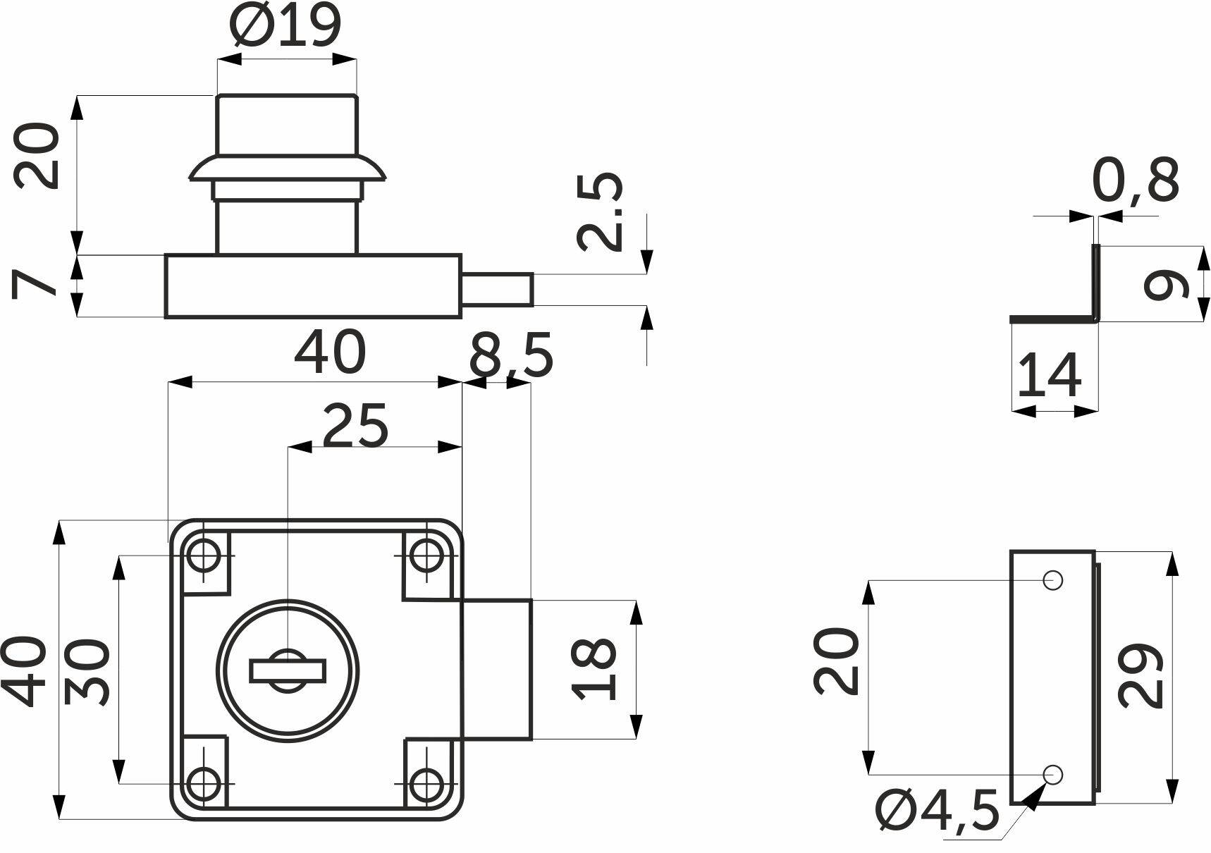 Данная модель является наиболее популярной среди мебельных замков. Замок предназначен для деревянных, ЛДСП, МДФ - фасадов толщиной 16-18 мм. Для монтажа данного типа замков необходимо высверлить отверстие для личинки цилиндра, сам же корпус замка крепится саморезами с обратной стороны фасада. С лицевой стороны фасада к замку монтируется декоративная накладка.