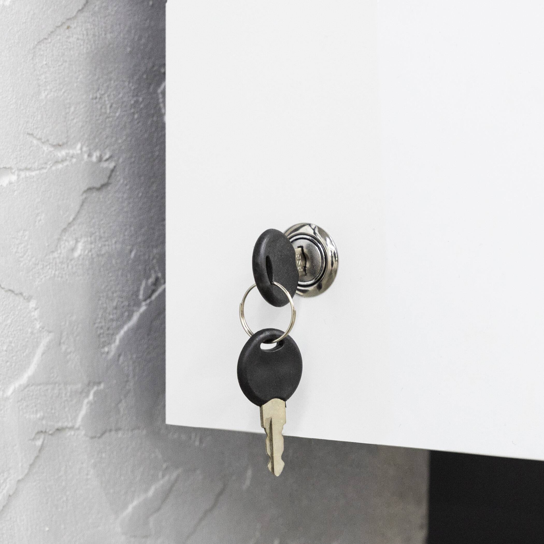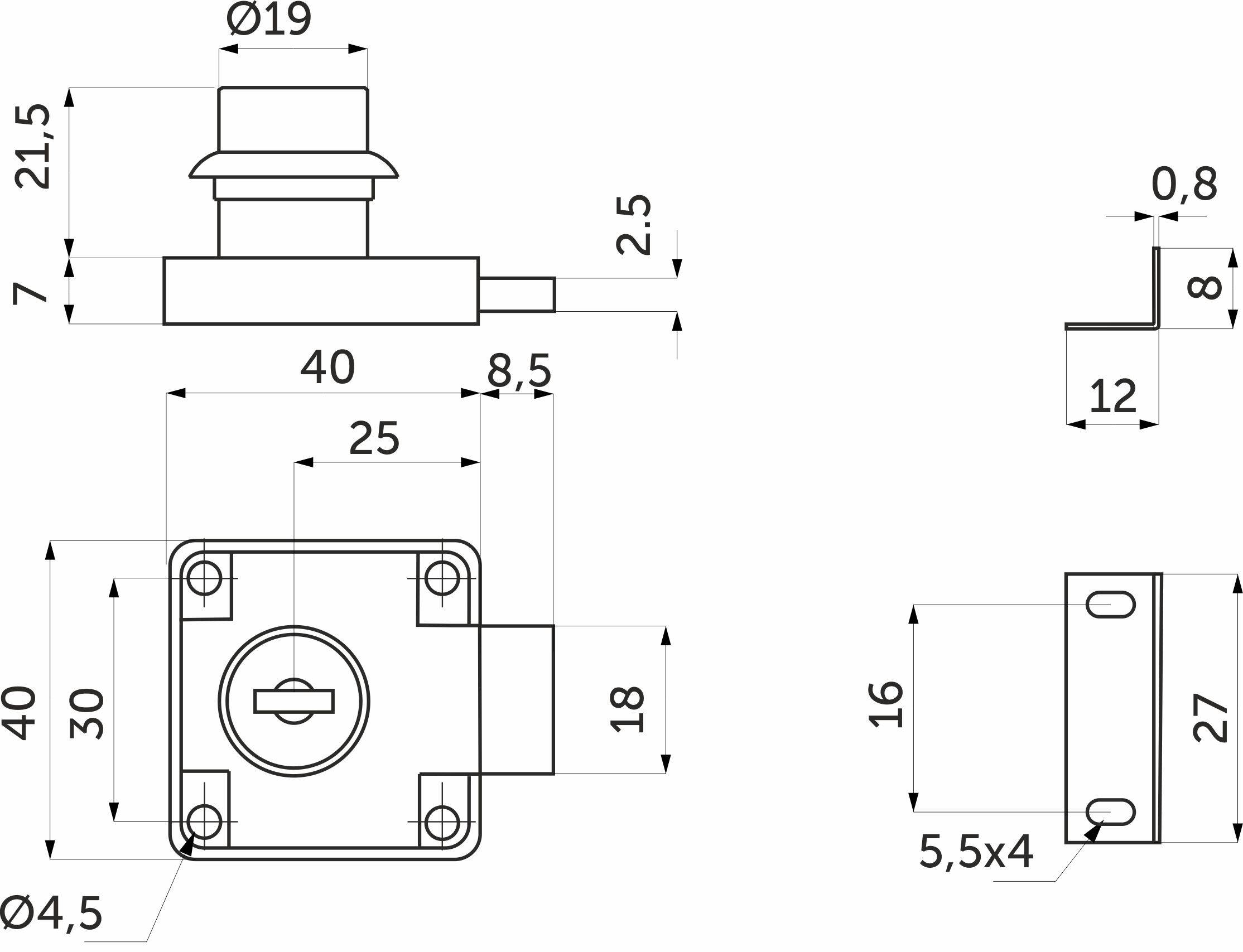 Данная модель является наиболее популярной среди мебельных замков. Замок предназначен для деревянных, ЛДСП, МДФ - фасадов толщиной 16-18 мм. Для монтажа данного типа замков необходимо высверлить отверстие для личинки цилиндра, сам же корпус замка крепится саморезами с обратной стороны фасада. С лицевой стороны фасада к замку монтируется декоративная накладка.