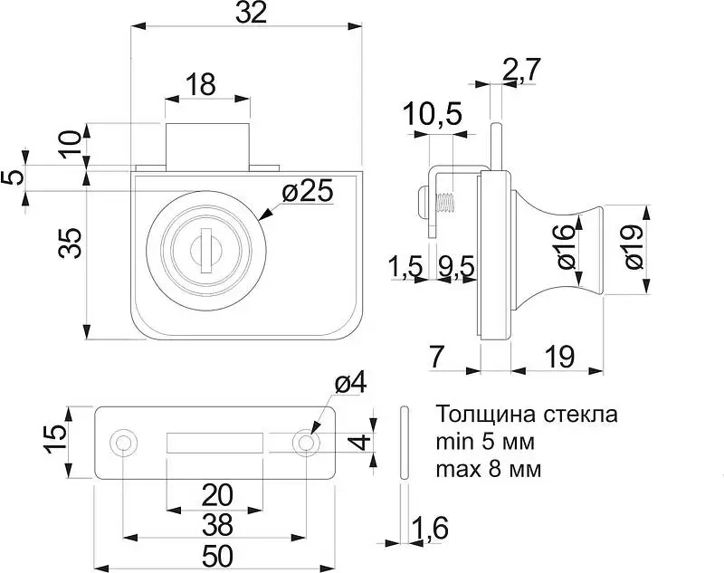 Замок для одностворчатой стеклянной двери. Данная модель является накладной, для её монтажа не требуется сверление стекла. Возможен монтаж стекла толщиной 4-8 мм.