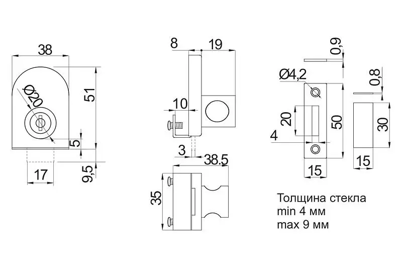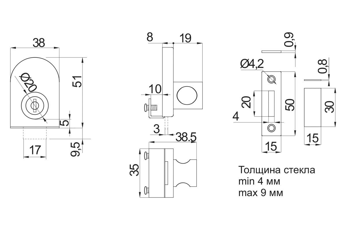 Замок для одностворчатой стеклянной двери. Данная модель является накладной, для её монтажа не требуется сверление стекла. Возможен монтаж стекла толщиной 4-8 мм.