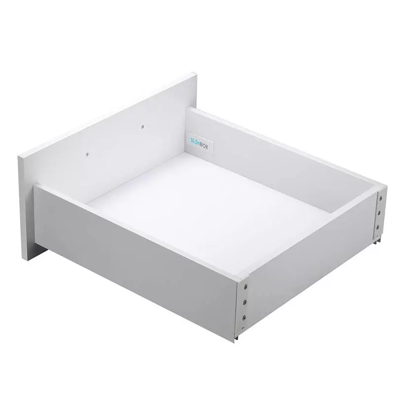 Slimbox с системой плавного закрывания представляет собой готовый комплект системы выдвижения с тонкими стальными боковинами. Толщина боковины в 13,5 мм позволяет увеличить полезное пространство ящика на 20%. Цвет: белый, высота ящика: 128 мм, длина направляющей: 500 мм.