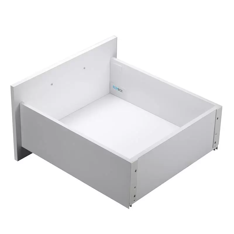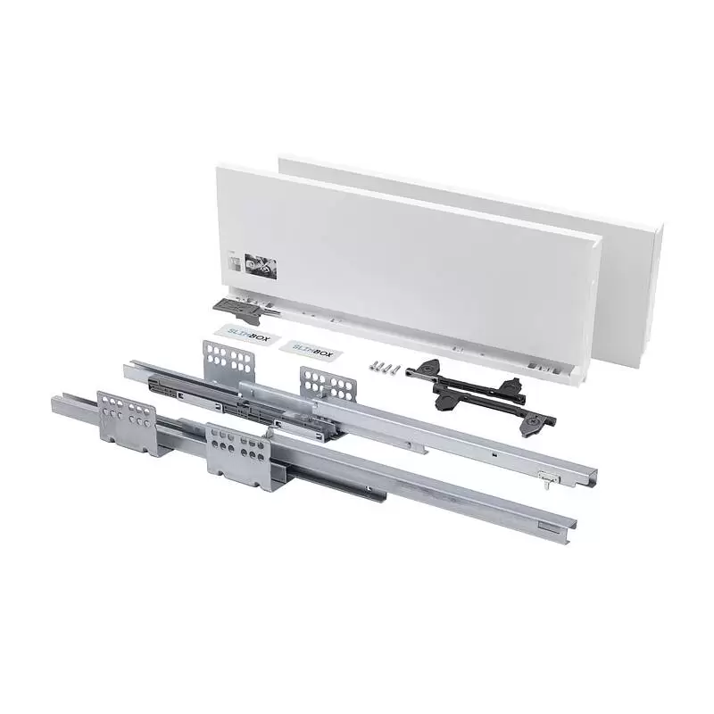 Slimbox с системой плавного закрывания представляет собой готовый комплект системы выдвижения с тонкими стальными боковинами. Толщина боковины в 13,5 мм позволяет увеличить полезное пространство ящика на 20%. Цвет: белый, высота ящика: 175 мм, длина направляющей: 500 мм.