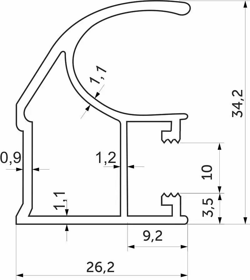 Данный профиль является как декоративным, так и функциональным элементом, защищает торцы дверного полотна от соприкосновения с боковыми стенками шкафа и дополнительно фиксирует ЛДСП, зеркало, стекло, другие декоративные элементы. Имеет только односторонний захват.
