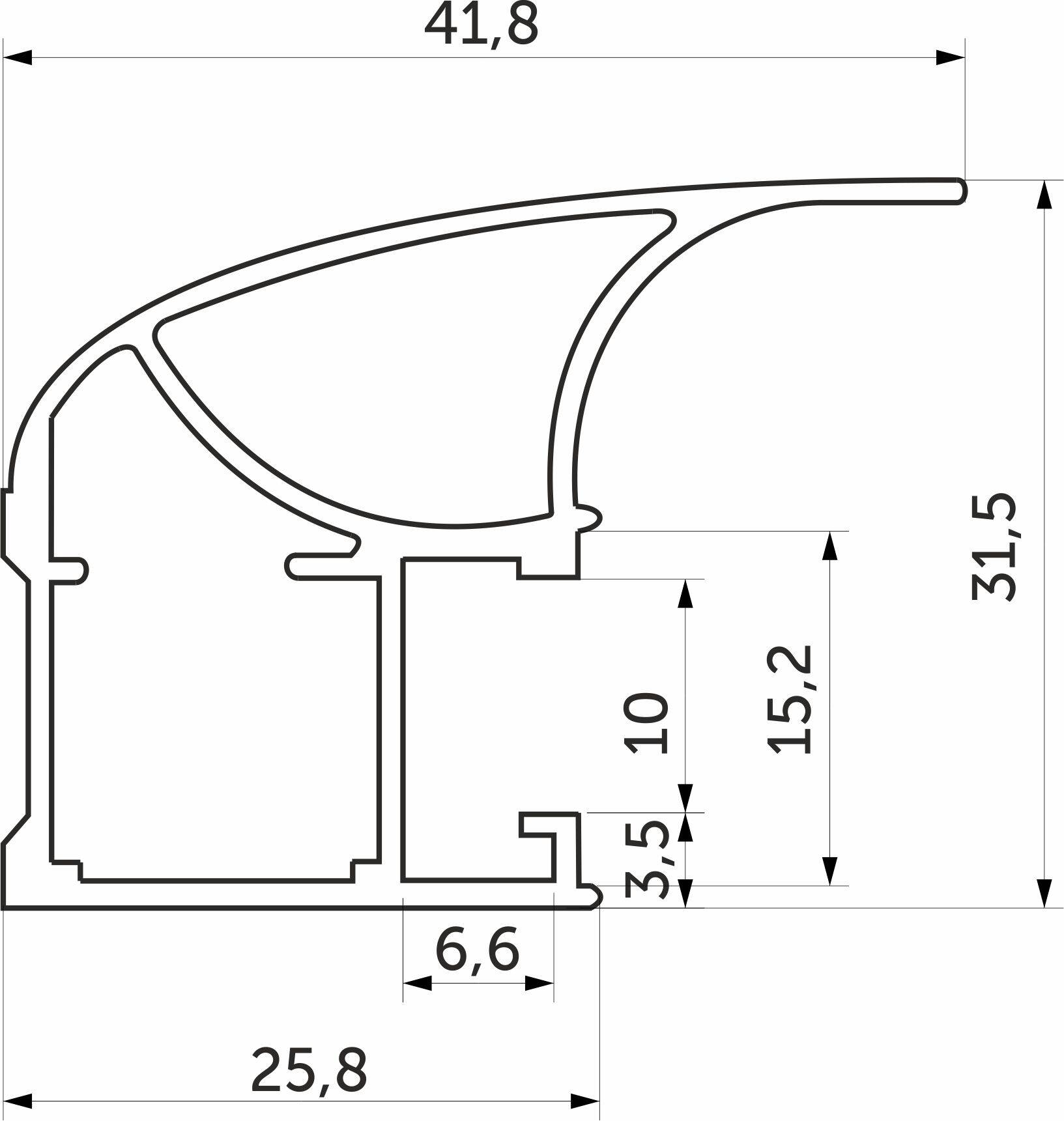 L - 5,3 м. Данный профиль является как декоративным, так и функциональным элементом, защищает торцы дверного полотна от соприкосновения с боковыми стенками шкафа и дополнительно фиксирует ЛДСП, зеркало, стекло, другие декоративные элементы. Имеет только односторонний захват. Отличается от стандартных вертикальный профилей классической система (Сенатор) большим размером ручки.