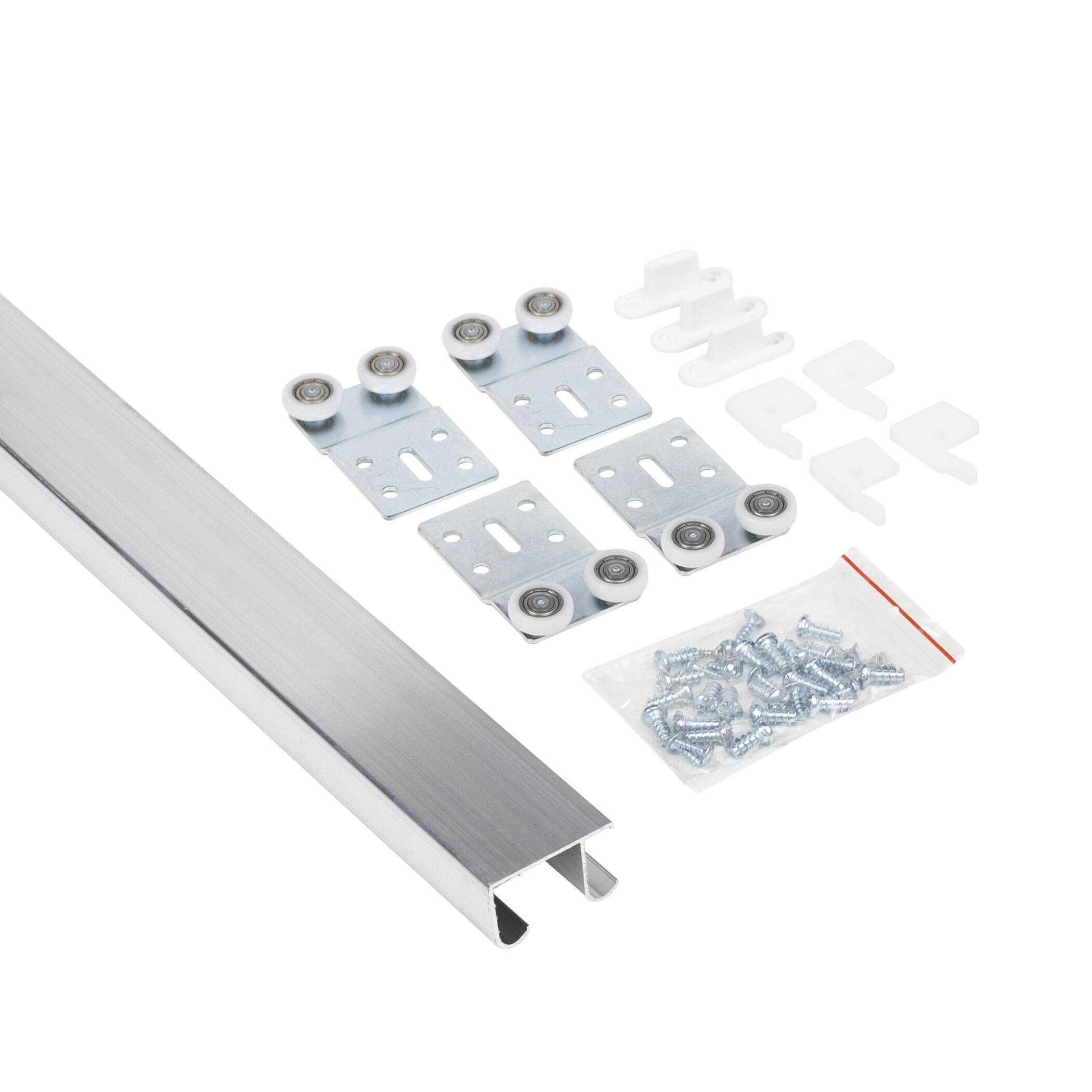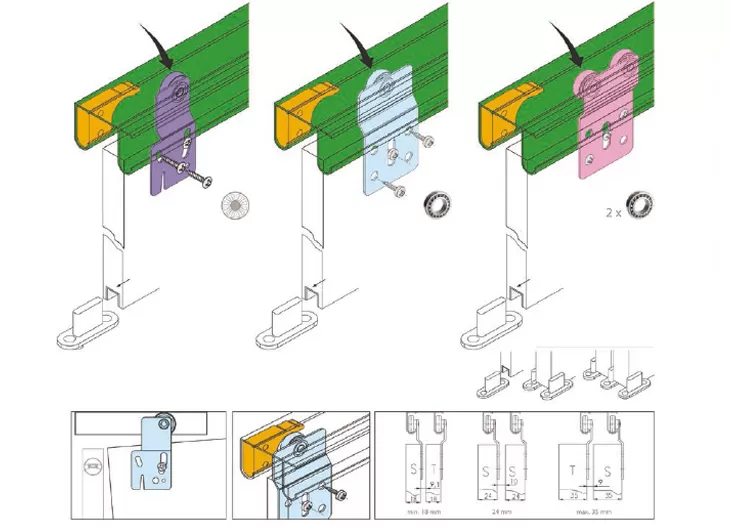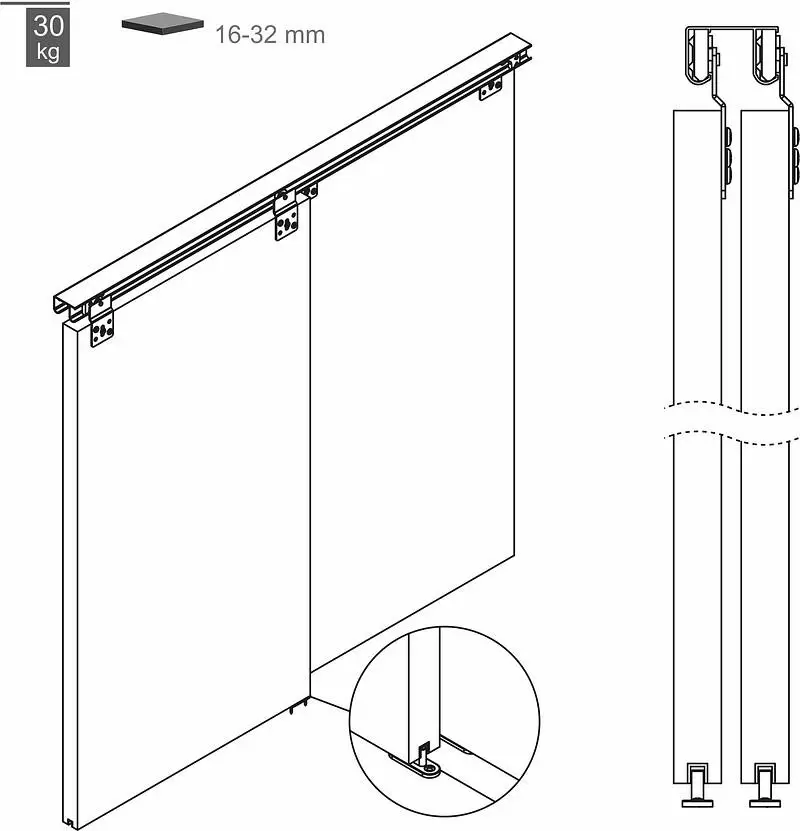 Двери без порога на одной шине, с подшипником, колесико из пластика. Для полотна 16-35 мм, максимальная нагрузка на комплект 50 кг. Предлагаемый ассортимент комплектующих позволяет изготавливать фасады весом до 50 кг и толщиной от 16 до 32 мм на одну, две либо три двери. В комплект входит шина верхняя двойная.