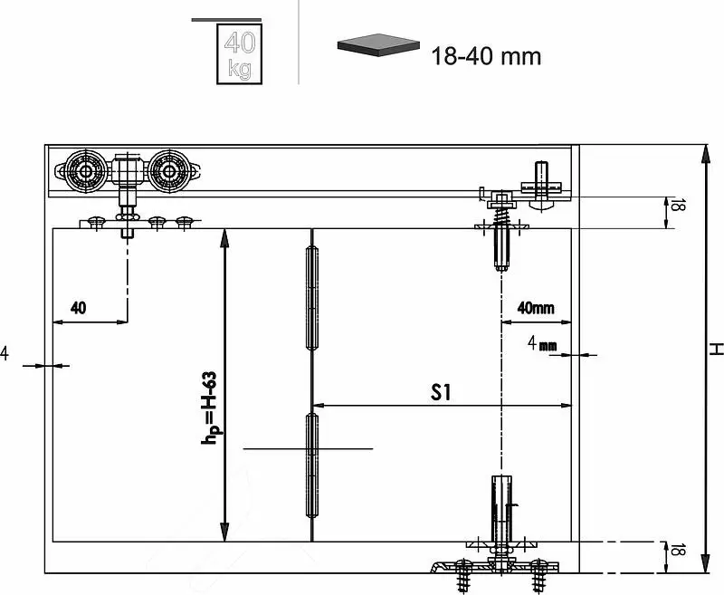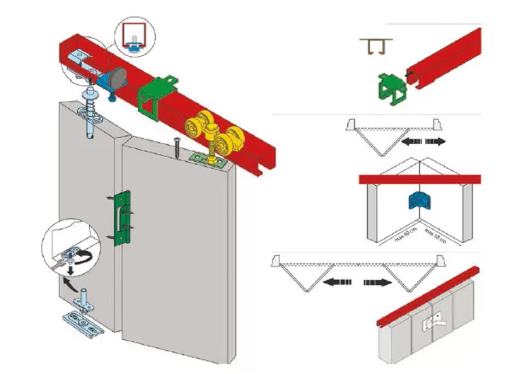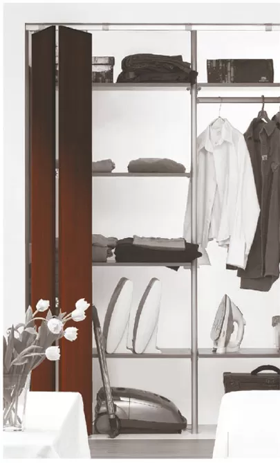 Двери складные без порога, с подшипником.. Для полотна 18-40 мм, максимальная ширина 50 см, максимальная нагрузка на комплект 40 кг. Такие решения применяются для встроенных шкафов и гардеробных комнат. STANFOLD крепится по схеме «пол–потолок» и не требует привязки к стене, снимая с нее какую-либо нагрузку. При этом максимальная ширина одного фасада состоящего из 2 створок составляет максимум 1000 мм.
