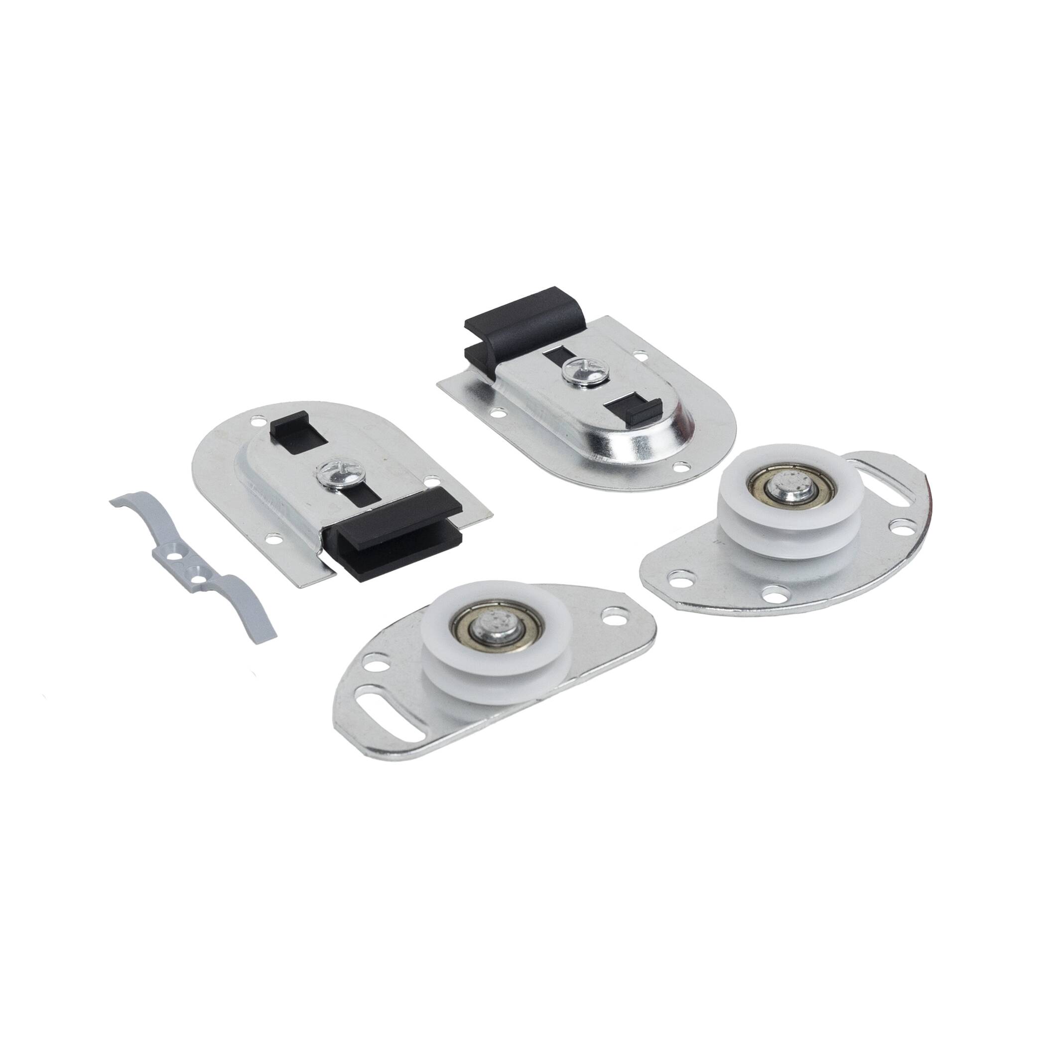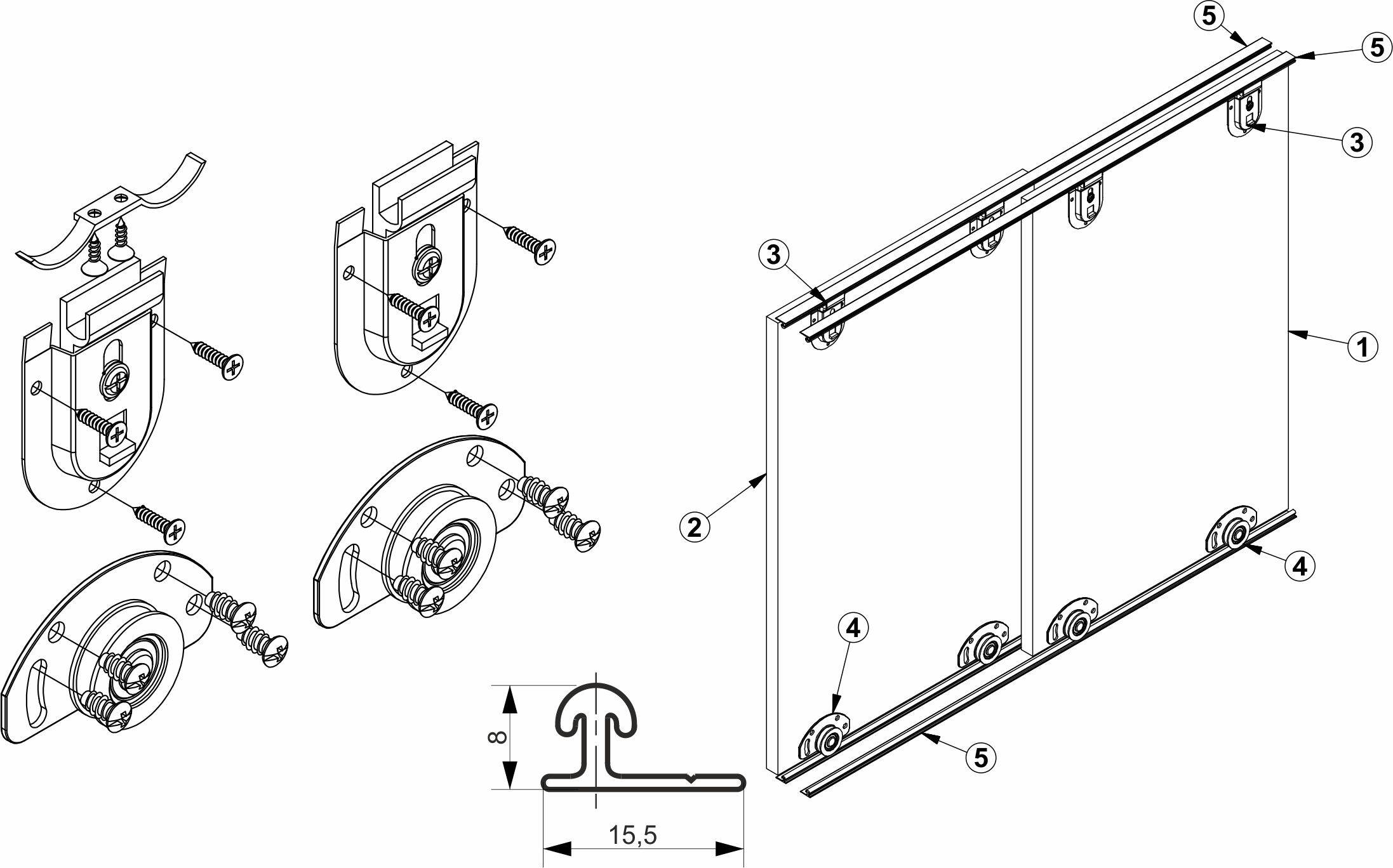 Простая раздвижная система с подшипником. Для полотна 10-42 мм, максимальная нагрузка на комплект 50 кг. Очень простая, недорогая и надежная система раздвижных дверей. Направляющая шина сверху и снизу применяется одинаковая.