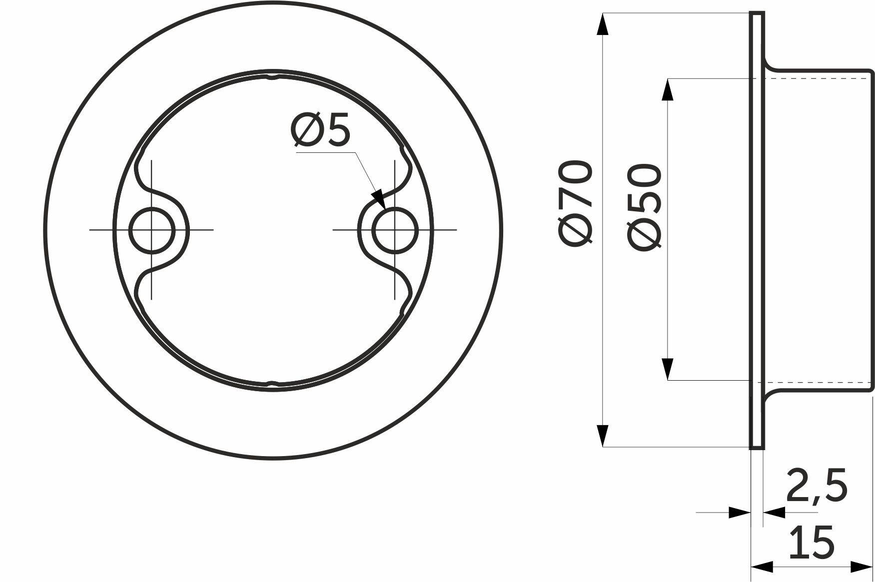 Крепление предназначено для фиксации трубы d50, все крепежи (отверстия, через которые фиксируют саморезами к поверхности) находятся внутри крепления.
