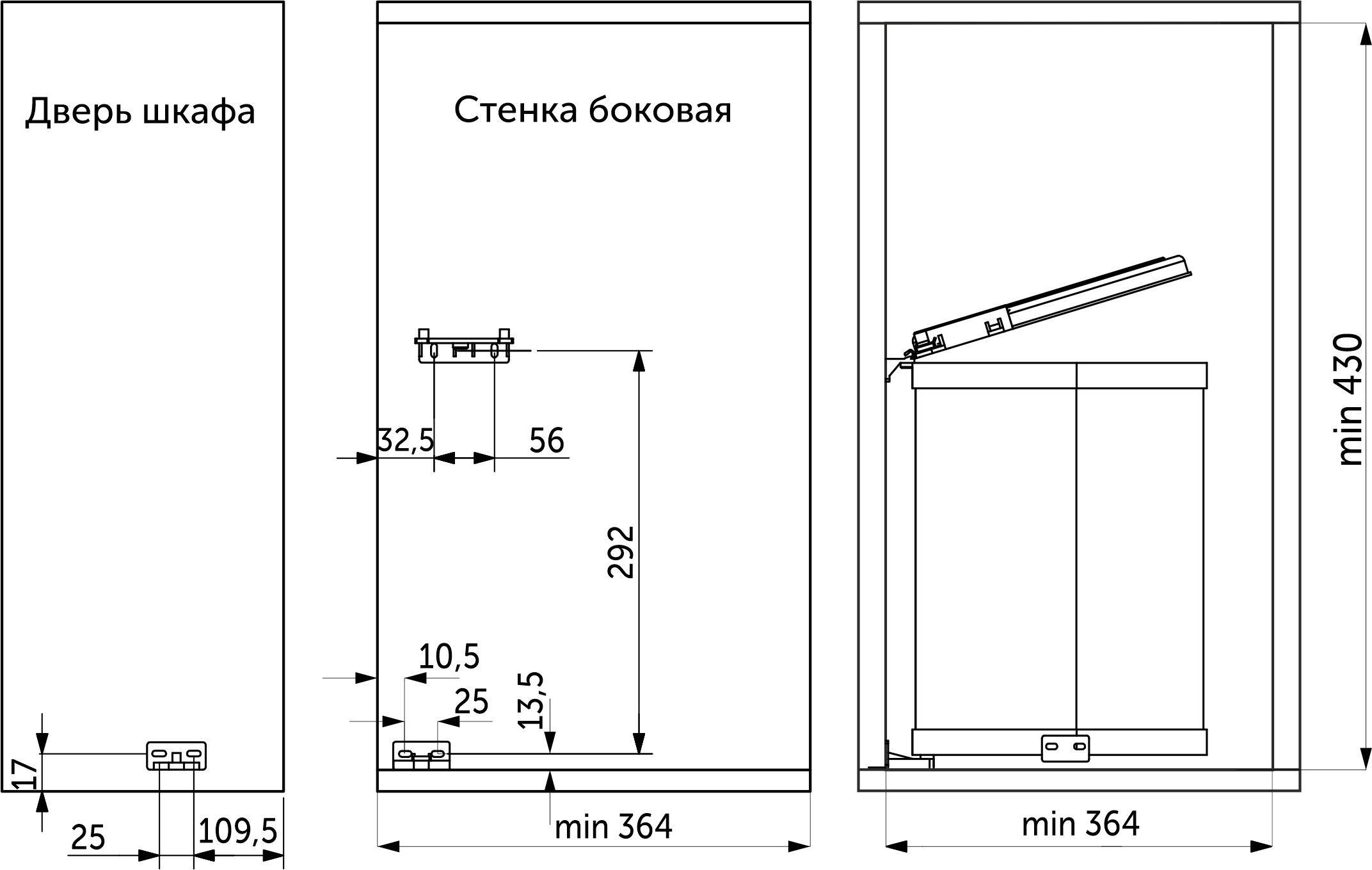 Навесная корзина для мусора с ведром-вкладышем на 14 л. Корзина крепится к фасаду. При открывании дверьки крышка сдвигается и немного приподнимается. Может навешиваться как с правой, так и слевой стороны ящика. Материал: пластик. Мин. ширина фасада - 364 мм.