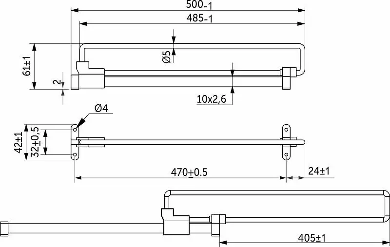 Вешалка изготовлена из цельнометаллического прута d5мм. Может крепиться на горизонтальные поверхности. Используется для размещения вешалок-плечиков с одеждой