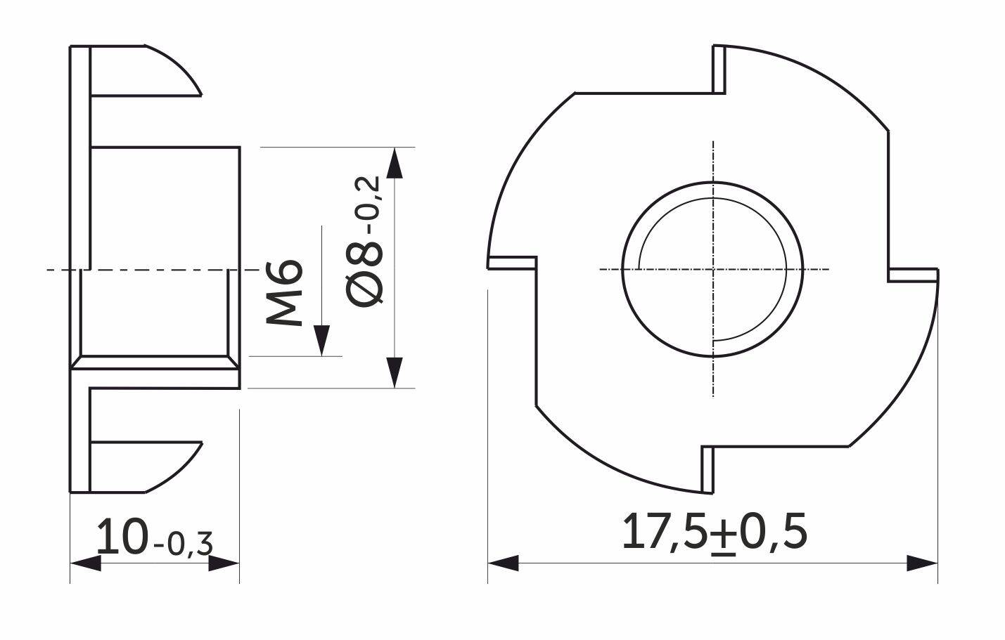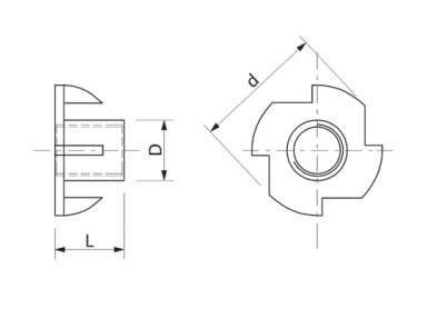 Гайка усовая (носковая, врезная, забивная, крыльчатая, T-nut, DIN 1624) предназначена для соединения деревянных элементов с использованием крепежных деталей с наружной метрической резьбой.