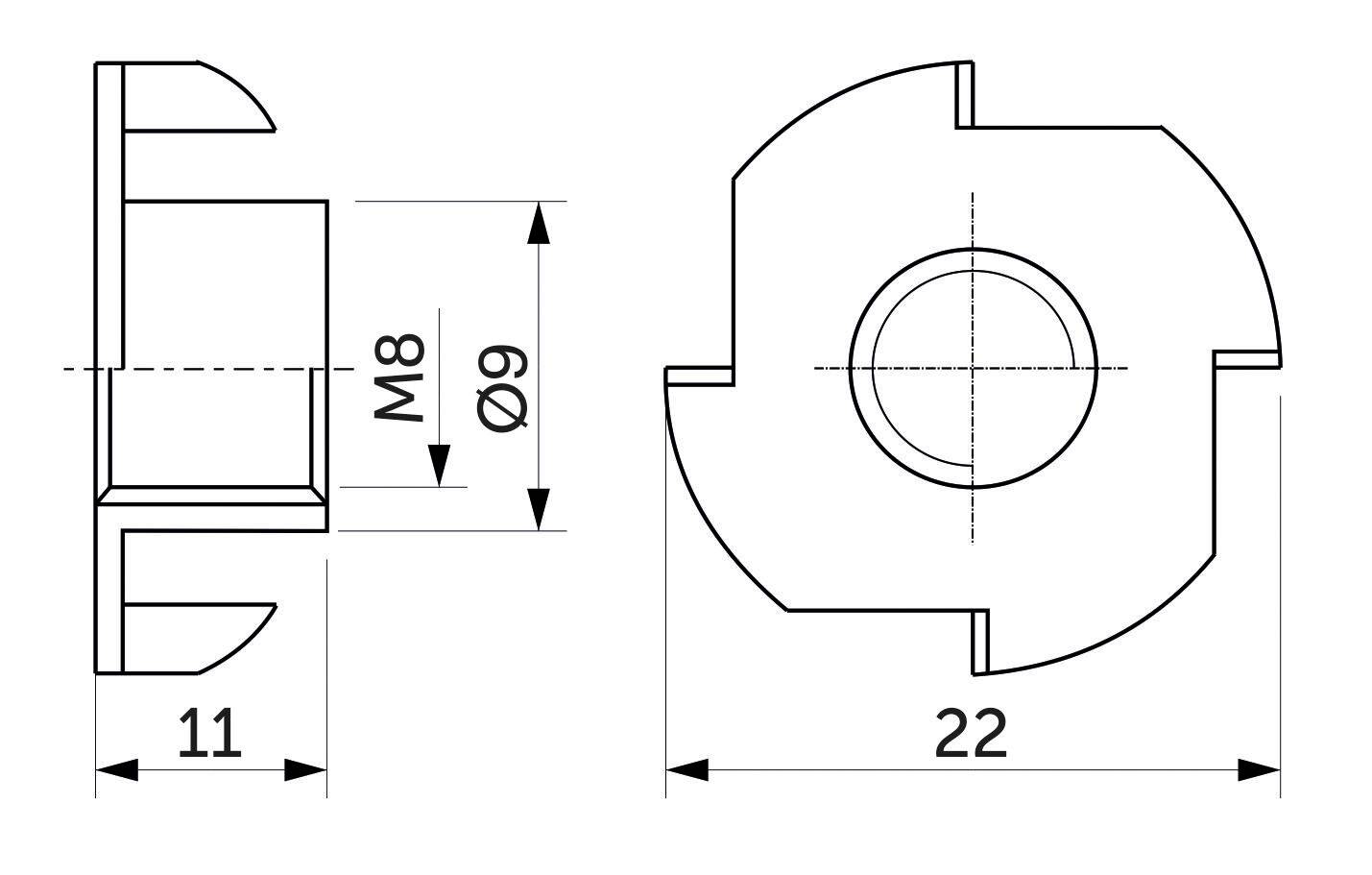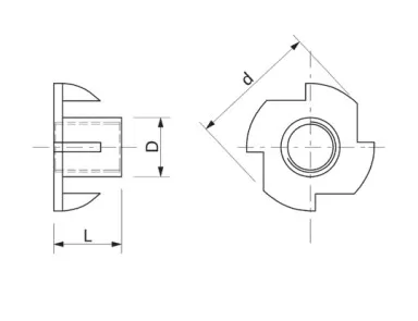 Гайка усовая (носковая, врезная, забивная, крыльчатая, T-nut, DIN 1624) предназначена для соединения деревянных элементов с использованием крепежных деталей с наружной метрической резьбой.