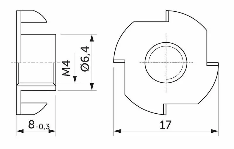 Гайка усовая (носковая, врезная, забивная, крыльчатая, T-nut, DIN 1624) предназначена для соединения деревянных элементов с использованием крепежных деталей с наружной метрической резьбой.