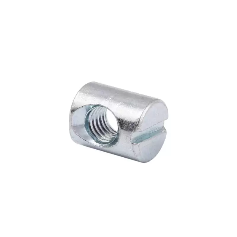 Гайка круглая несимметричная (гайка-бочонок) является составляющей винтовой стяжки вместе с винтами (например винтами с плоской головкой с шестигранным гнездом). Длина гайки 13 мм, наружный диаметр 10 мм и она имеет внутреннюю резьбу М6. Гайка-бочонок имеет смещенное относительно центра отверстие с метрической резьбой и прямой шлиц на торце для правильного позиционирования гайки внутри детали (для установки отверстия гайки в одну линию с отверстием в детали мебели для винта). Соединение посредством данной гайки и винта отличается надежностью и долговечностью соединения.