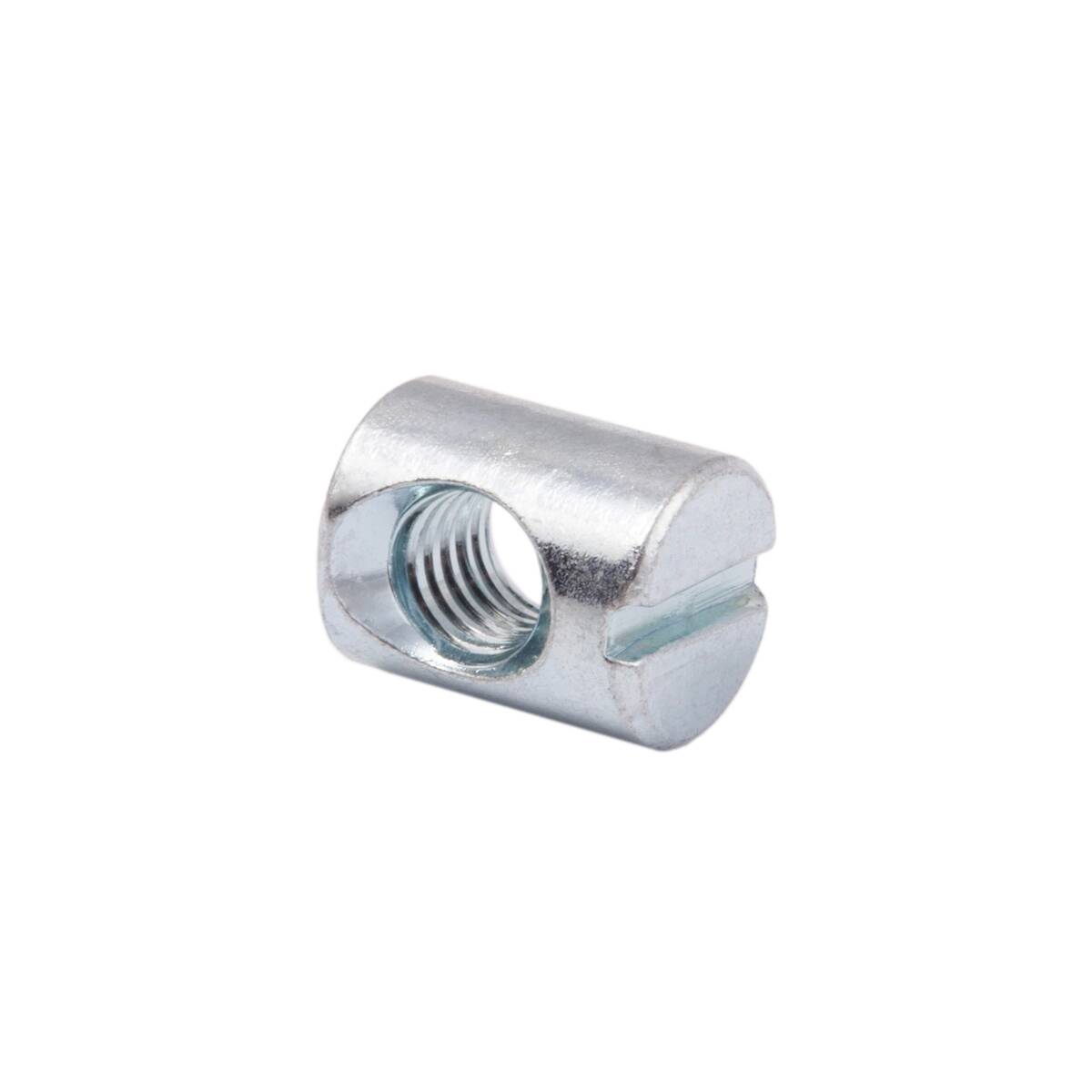 Гайка круглая несимметричная (гайка-бочонок) является составляющей винтовой стяжки вместе с винтами (например винтами с плоской головкой с шестигранным гнездом). Длина гайки 13 мм, наружный диаметр 10 мм и она имеет внутреннюю резьбу М6. Гайка-бочонок имеет смещенное относительно центра отверстие с метрической резьбой и прямой шлиц на торце для правильного позиционирования гайки внутри детали (для установки отверстия гайки в одну линию с отверстием в детали мебели для винта). Соединение посредством данной гайки и винта отличается надежностью и долговечностью соединения.