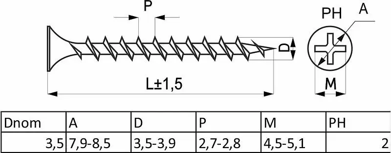 Саморез для гипсокартона для крепления к дереву имеет крупный шаг резьбы и шлиц PH.